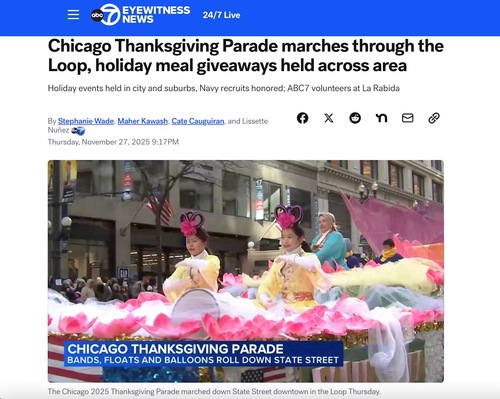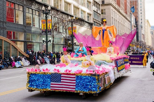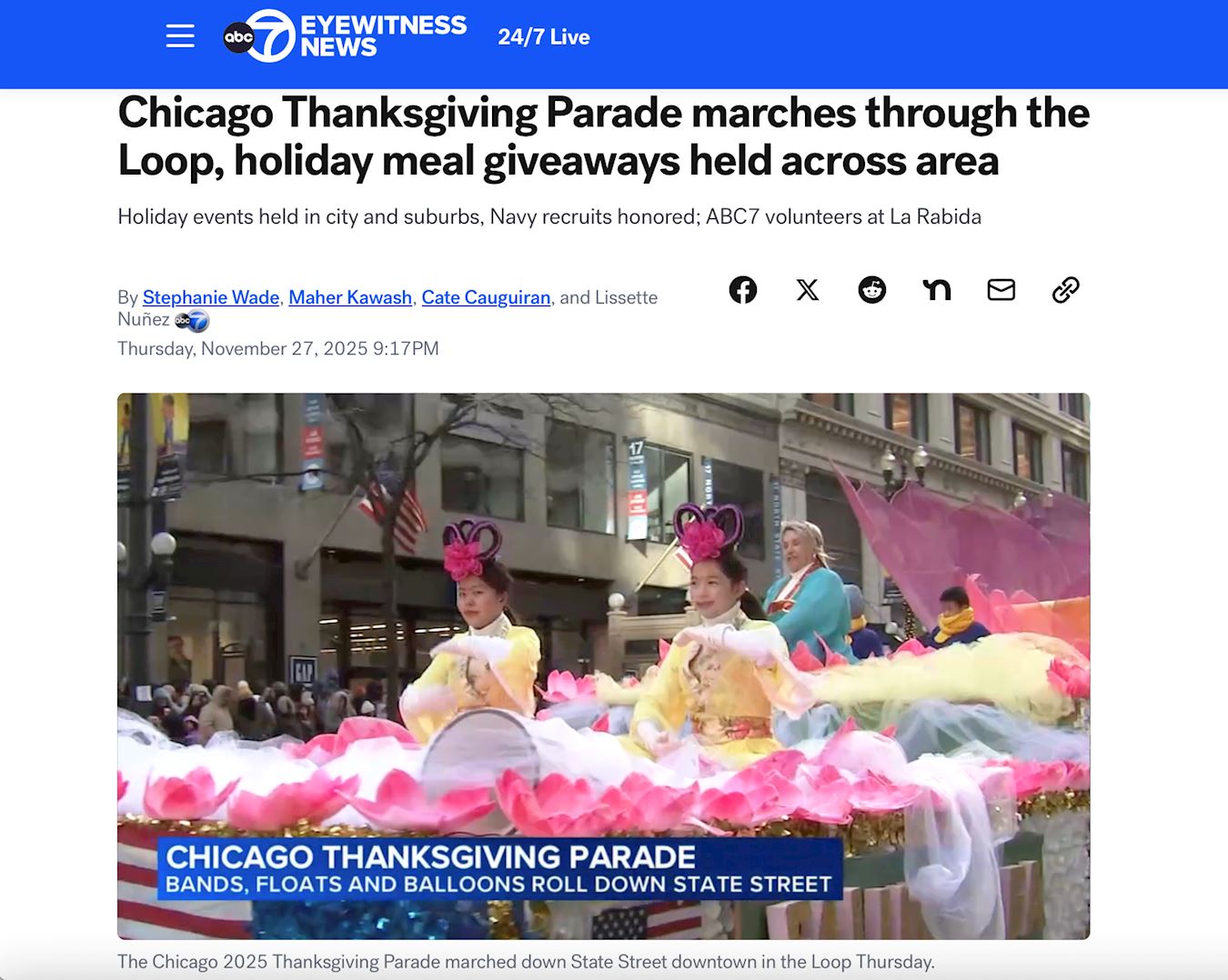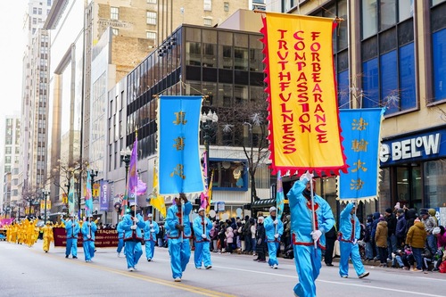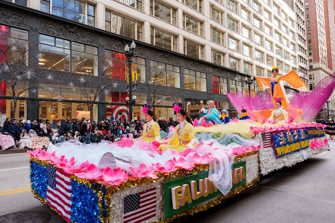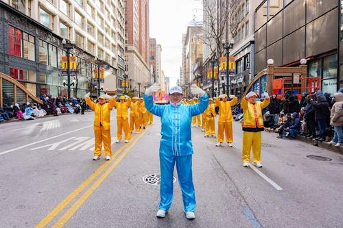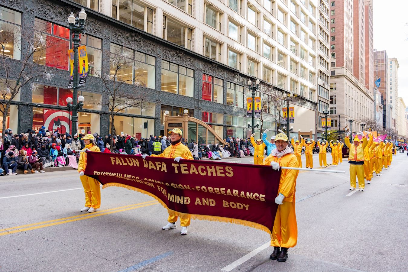 (Minghui.org) 27 listopada 2025 r. odbyła się 91. parada z okazji Święta Dziękczynienia w Chicago. Był to najzimniejszy dzień tej zimy w Chicago, ale mimo to wielu widzów zgromadziło się wzdłuż ulic, aby obejrzeć paradę.