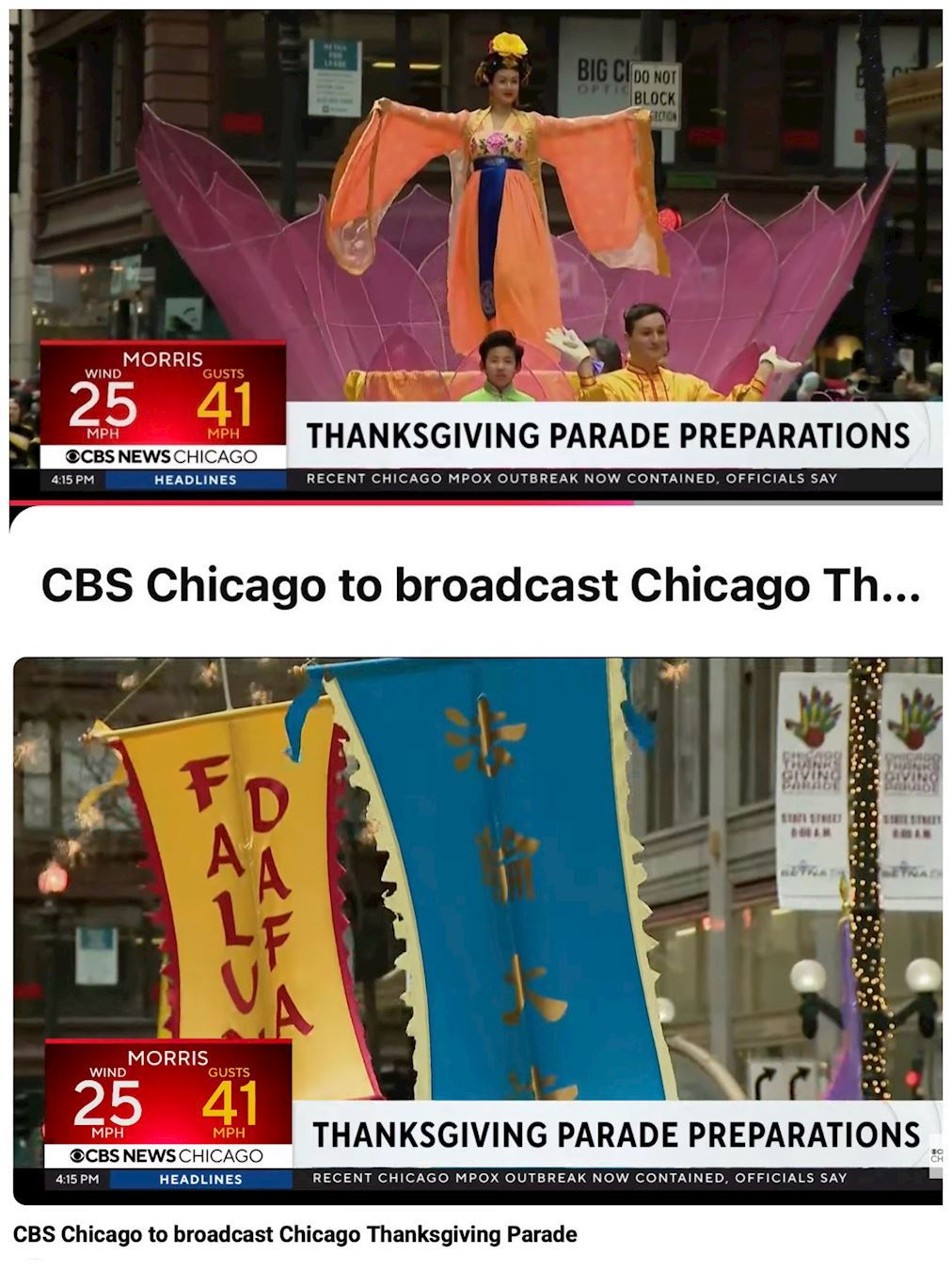 CBS Chicago podkreśla udział Falun Dafa w paradzie w 2024 roku w swoim 34-sekundowym zwiastunie. (Składające się ze zrzutów ekranu)