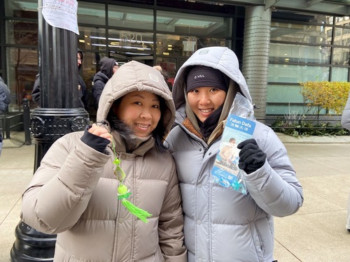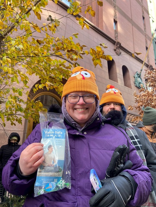 Powiedziała, że Święto Dziękczynienia jest świętem, które skłania ją do refleksji i jeszcze większego docenienia Falun Dafa. Jej rodzice i dzieci odnieśli korzyści z praktykowania Dafa. „Jestem naprawdę wdzięczna za możliwość praktykowania kultywacji” – powiedziała. „Mam nadzieję, że dzięki tej paradzie ludzie będą mogli poczuć pozytywną energię i ciepło Falun Dafa w te mroźne święta”.