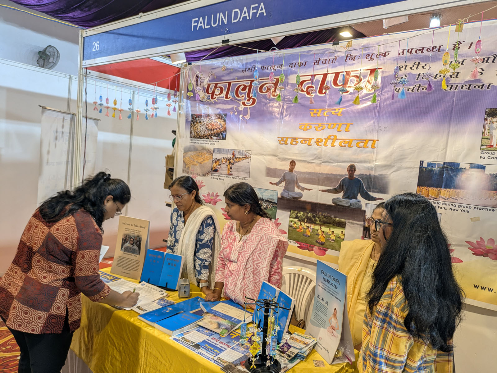 Odwiedzający stoisko Falun Dafa podczas targów książki w Pune