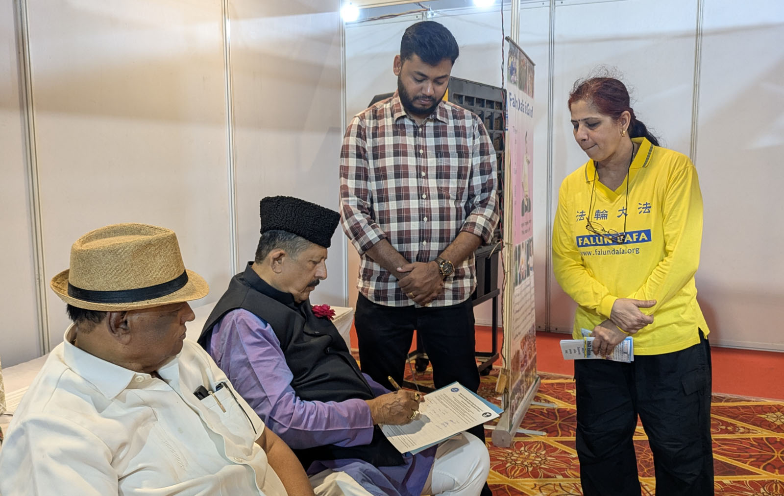 Odwiedzający podpisują petycję DAFOH przy stoisku Falun Dafa podczas targów książki w Pune