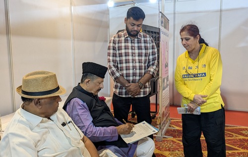 Pan Ghanekar powiedział: „Jestem zapalonym czytelnikiem i najbardziej lubię książki o duchowości. Wyczułem dobrą energię na stoisku i chciałbym przeczytać więcej o Falun Dafa”. Kupił książkę i wyraził zamiar skontaktowania się z praktykującymi, aby dowiedzieć się więcej o praktyce.