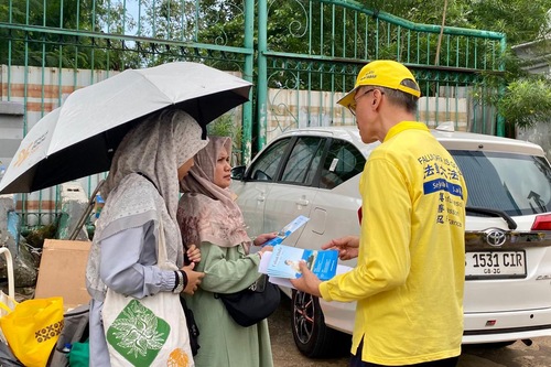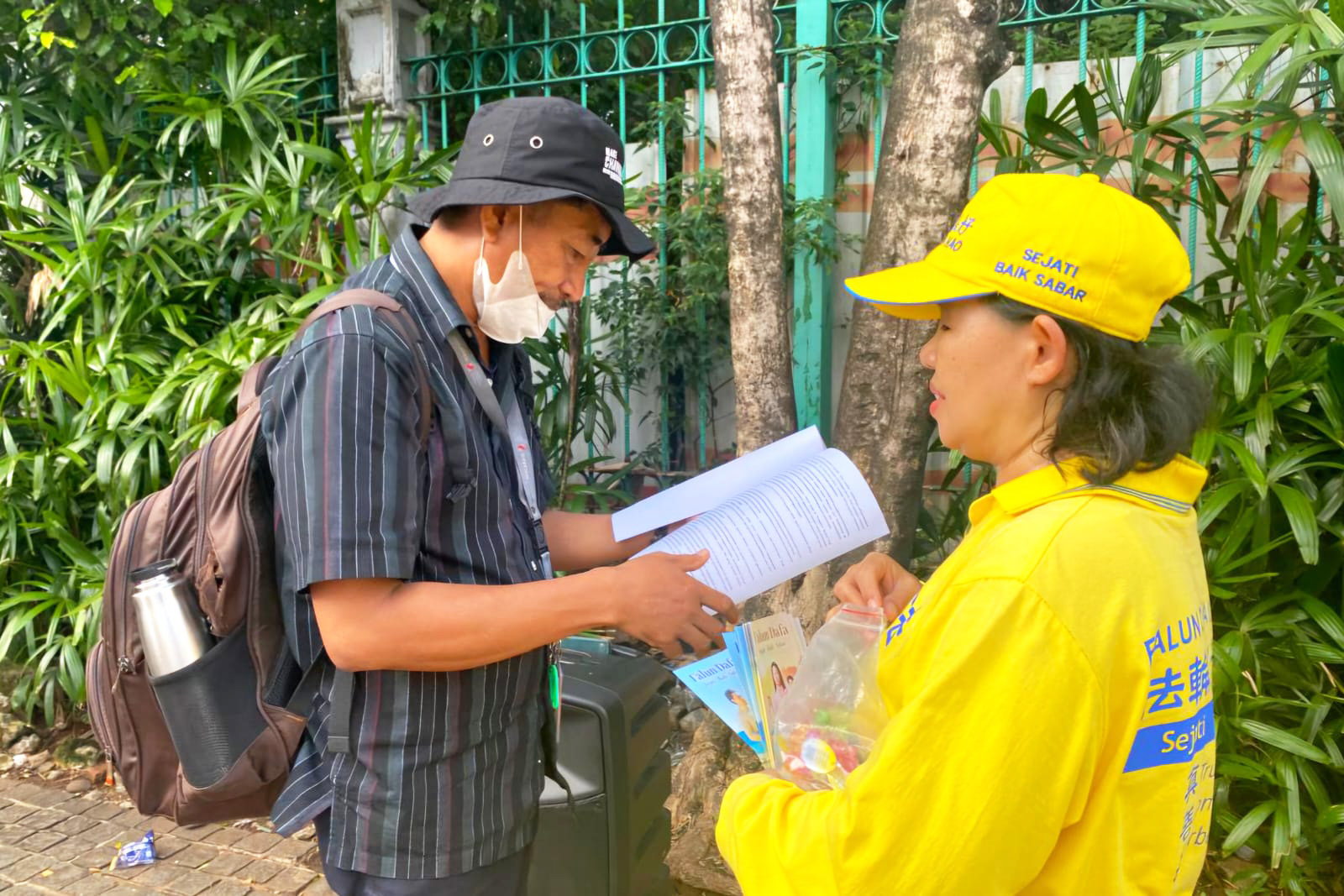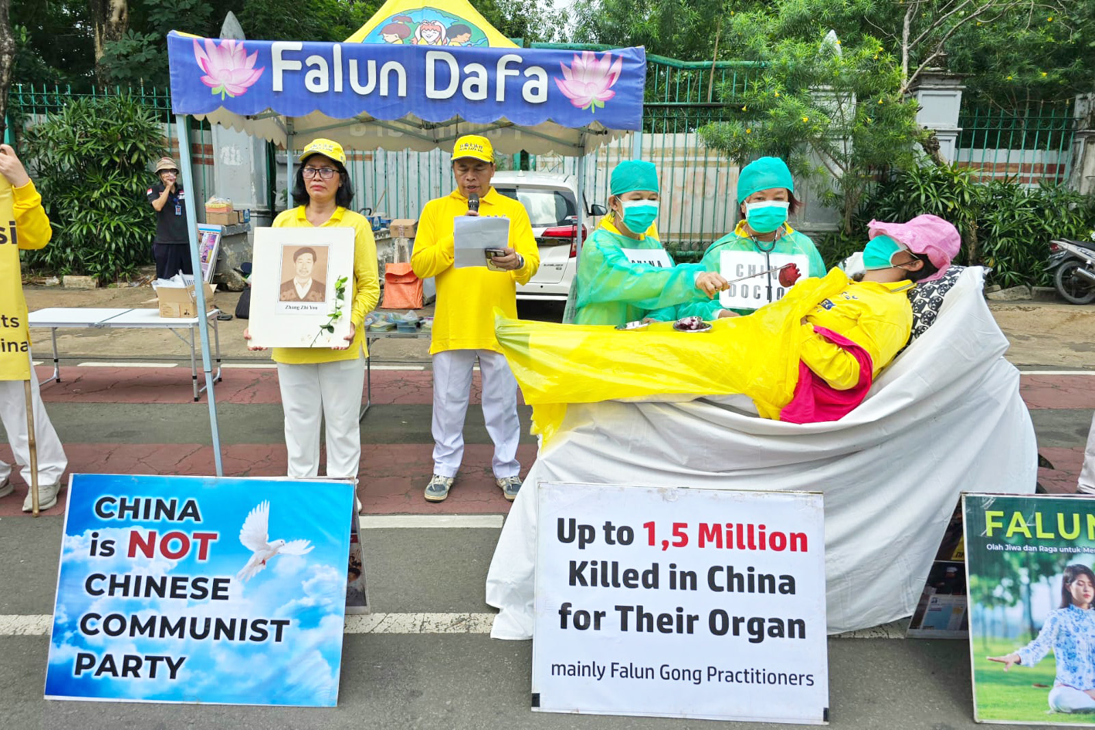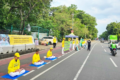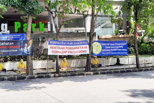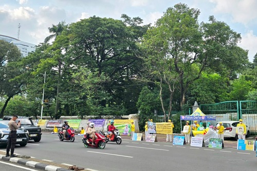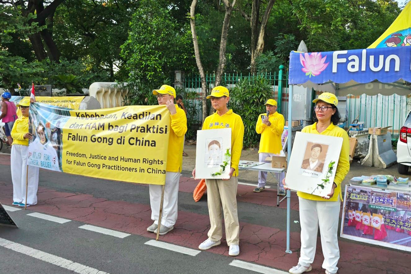 13 grudnia 2025 r. praktykujący zorganizowali wiec w pobliżu bramy wejściowej do Pomnika Narodowego, jednego z głównych punktów turystycznych w Dżakarcie. Wyświetlali transparenty z hasłami wzywającymi do zakończenia prześladowań. Odtworzyli scenę sankcjonowanego przez państwo przymusowego pobierania organów w Chinach i rozdawali ulotki ujawniające trwające prześladowania Falun Dafa w Chinach przez KPCh.