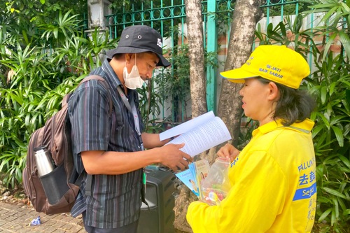 Praktykujący wyjaśnił, że nie jest to miejsce ćwiczeń – organizują pokojowy wiec, aby sprzeciwić się prześladowaniom Falun Gong w Chinach, wskazując na konsulat po drugiej stronie ulicy. Praktykujący poinformował go, gdzie znajdują się lokalne miejsca ćwiczeń, aby mógł kontynuować naukę ćwiczeń.