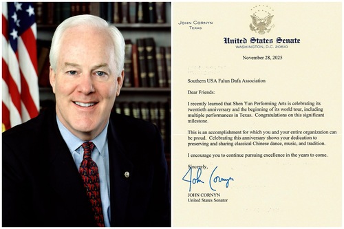 Senator John Cornyn z Teksasu napisał: „Niedawno dowiedziałem się, że Shen Yun Performing Arts świętuje dwudziestolecie istnienia i rozpoczęcie światowej trasy występów. W programie znajduje się wiele występów w Teksasie. Gratuluję tego znaczącego osiągnięcia.