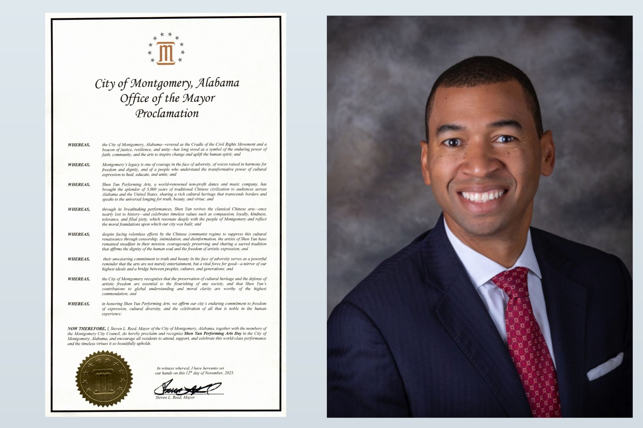 „Ja, Steven L. Reed, burmistrz miasta Montgomery w stanie Alabama, wraz z członkami Rady Miasta Montgomery, niniejszym ogłaszam i uznaję Dzień Shen Yun Performing Arts w mieście Montgomery w stanie Alabama i zachęcam wszystkich mieszkańców do udziału, wsparcia i świętowania tego światowej klasy widowiska oraz ponadczasowych wartości, które tak pięknie propaguje”.