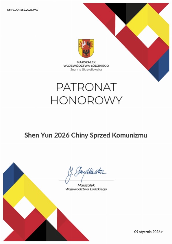 Prezydent Łodzi oraz burmistrzowie Łodzi i Torunia przyznali Shen Yun „Patronat Honorowy”, wysokie wyróżnienie w Polsce zarezerwowane dla wydarzeń kulturalnych o wyjątkowych walorach artystycznych i prestiżu.