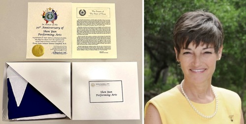 Senator stanu Teksas Donna Campbell, dr med., napisała w certyfikacie przekazującym Shen Yun flagę: