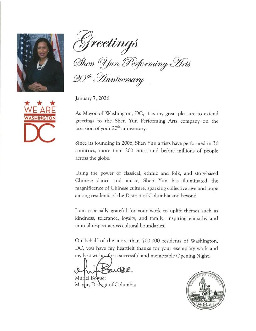 Muriel Bowser, burmistrz Waszyngtonu, napisała list gratulacyjny do Shen Yun Performing Arts z okazji 20 rocznicy powstania