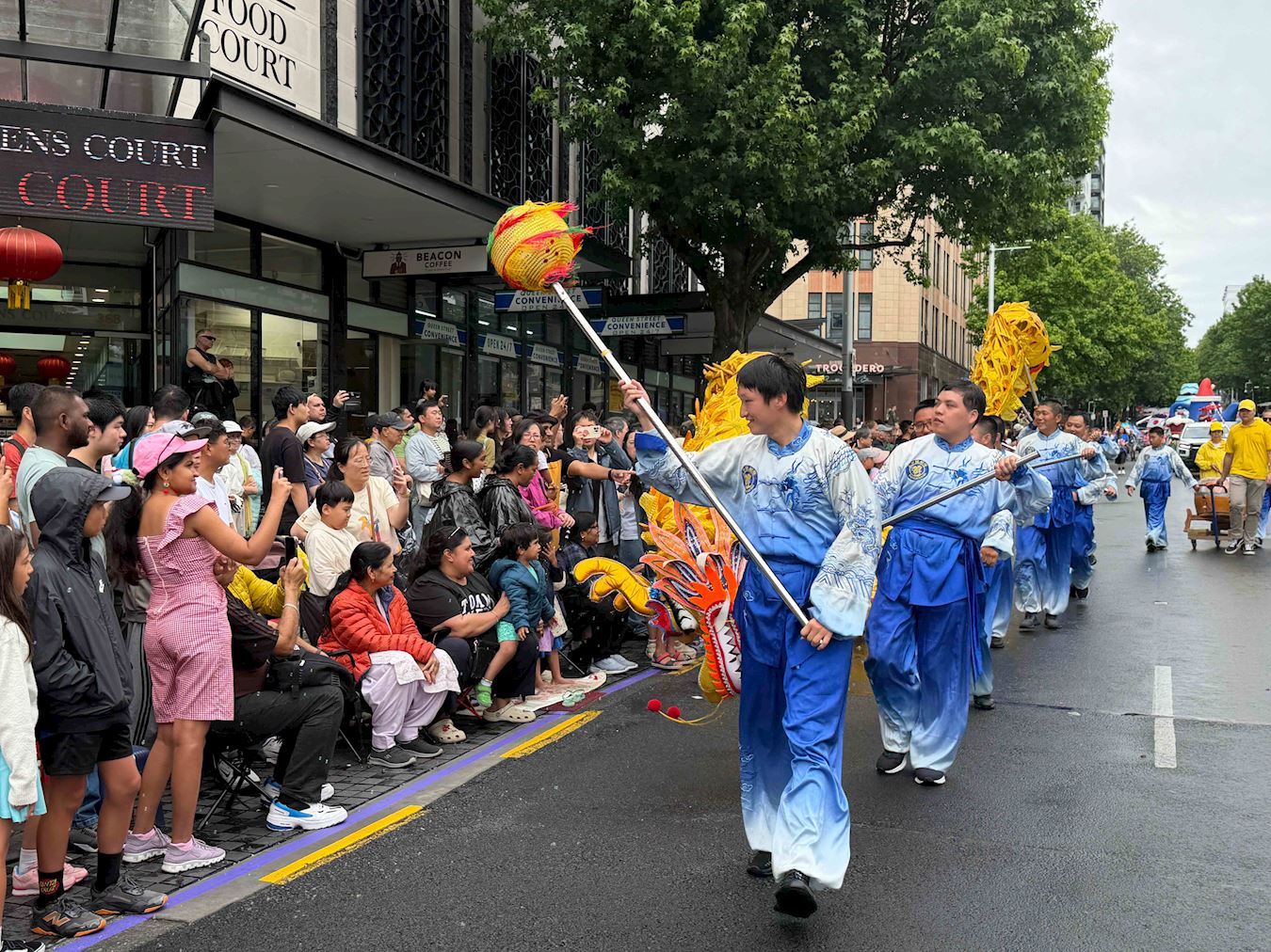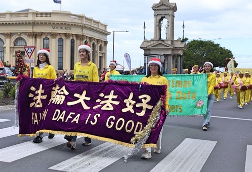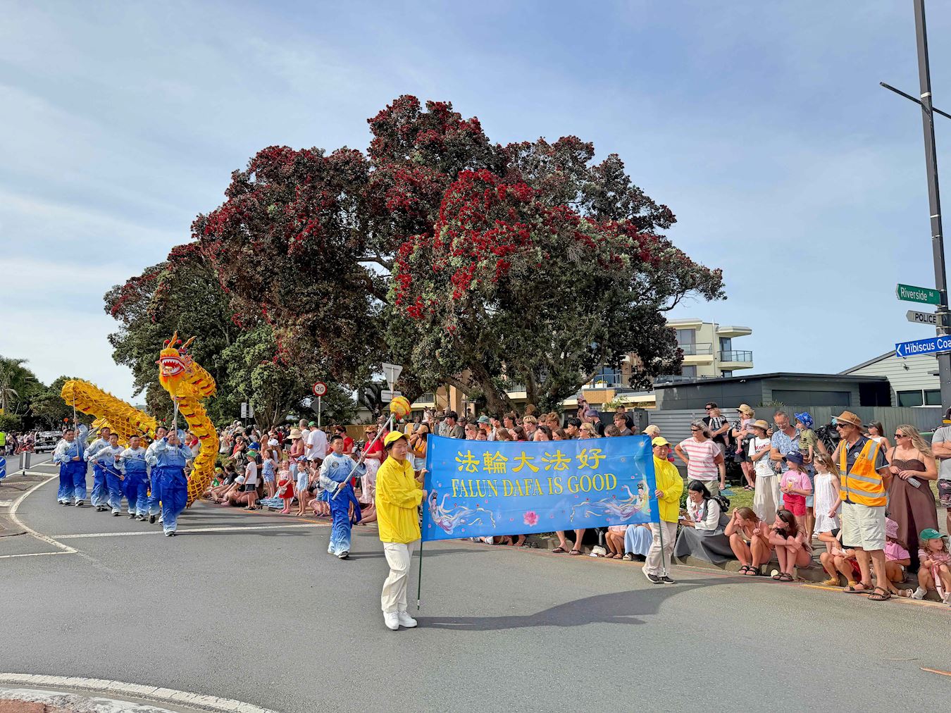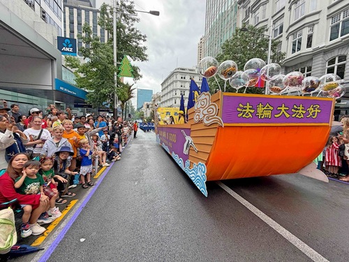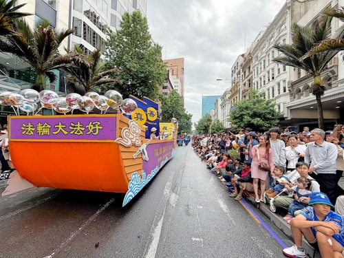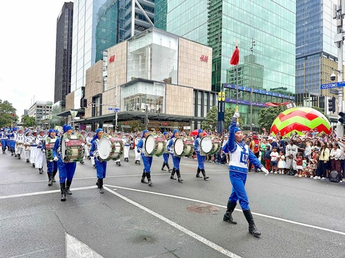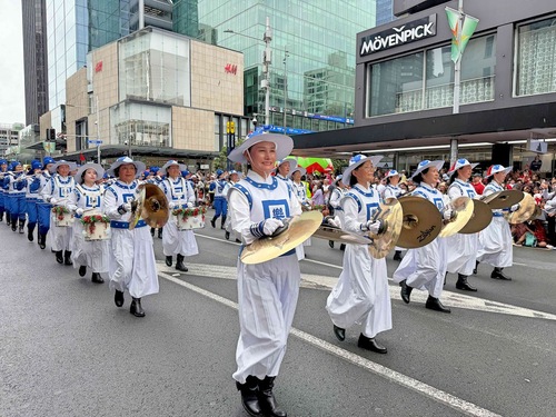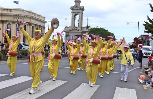 Orkiestra Marszowa Tian Guo, złożona z praktykujących Falun Dafa z Nowej Zelandii i Australii, została powitana gorącymi brawami. Ludzie robili zdjęcia, komplementowali orkiestrę za jej niebiesko-białe stroje i mówili, że muzyka orkiestry idealnie komponowała się z uroczystą atmosferą wydarzenia. Przyciągające wzrok banery z napisem „Prawda, Życzliwość, Cierpliwość” zdobiły platformę, za którą podążał zespół tańczący smoka, co bardzo podobało się dzieciom.