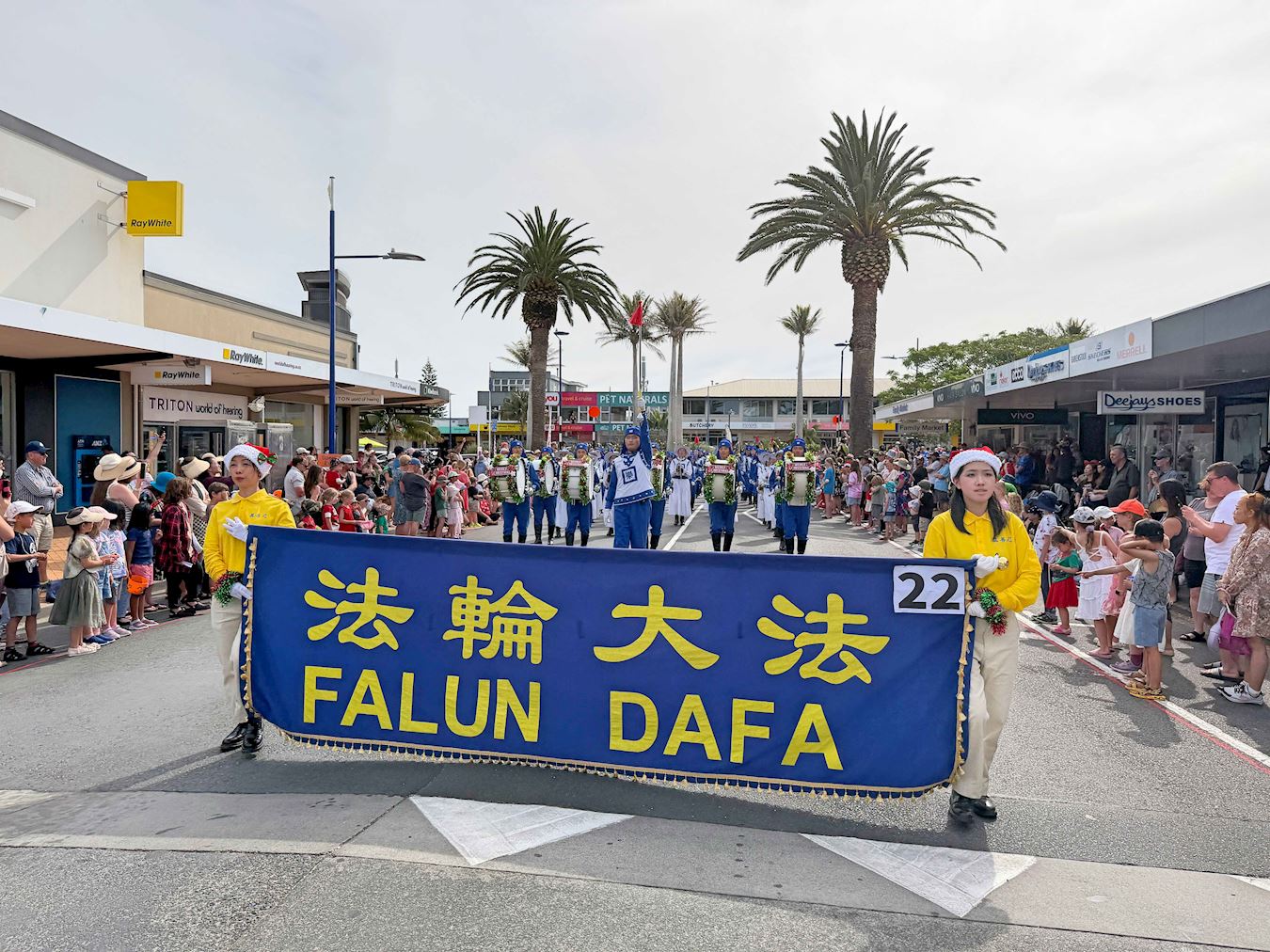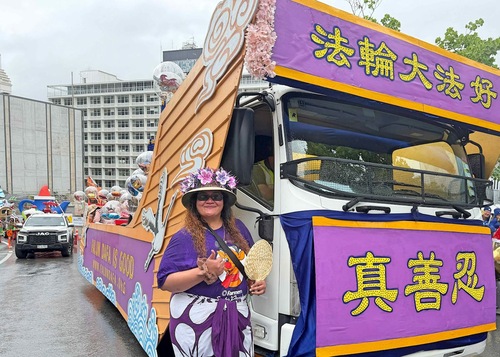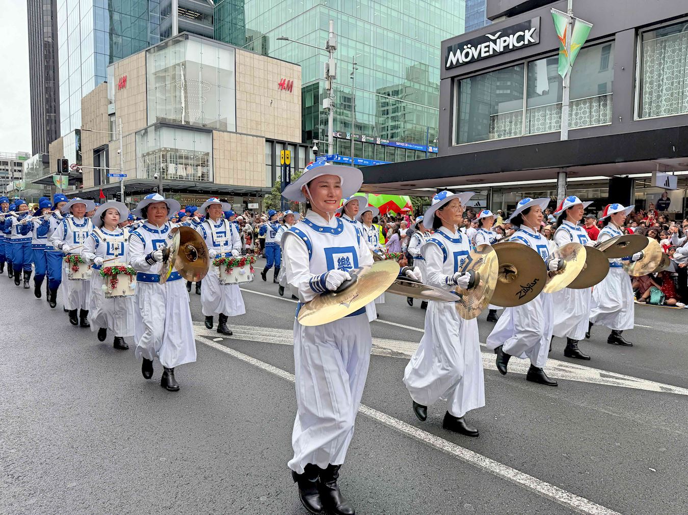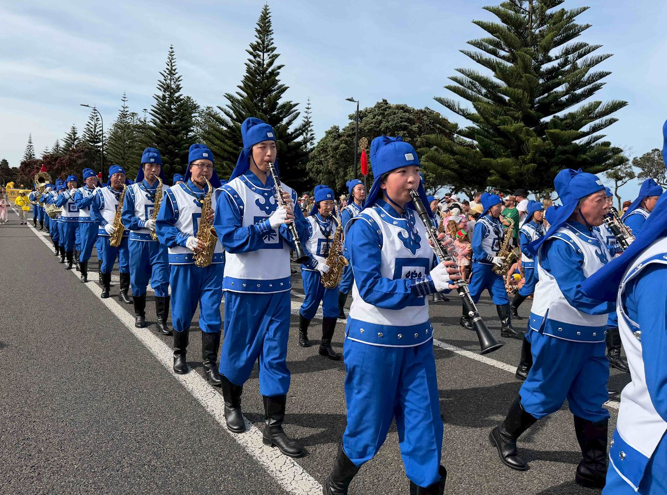 Orkiestra Marszowa Tian Guo, złożona z praktykujących Falun Dafa z Nowej Zelandii i Australii, została powitana gorącymi brawami. Ludzie robili zdjęcia, komplementowali orkiestrę za jej niebiesko-białe stroje i mówili, że muzyka orkiestry idealnie komponowała się z uroczystą atmosferą wydarzenia. Przyciągające wzrok banery z napisem „Prawda, Życzliwość, Cierpliwość” zdobiły platformę, za którą podążał zespół tańczący smoka, co bardzo podobało się dzieciom.