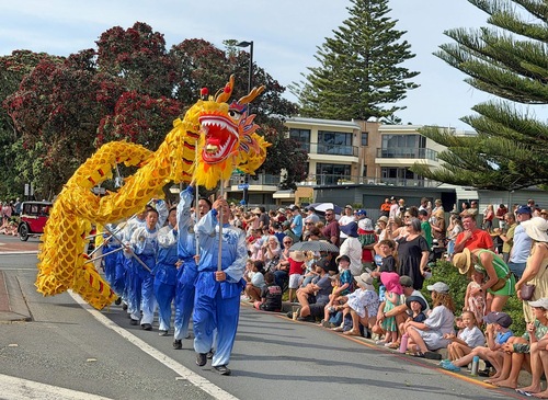 Orkiestra Marszowa Tian Guo i zespół tańca smoka podczas parady w Orewa 29 listopada