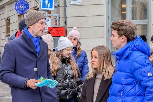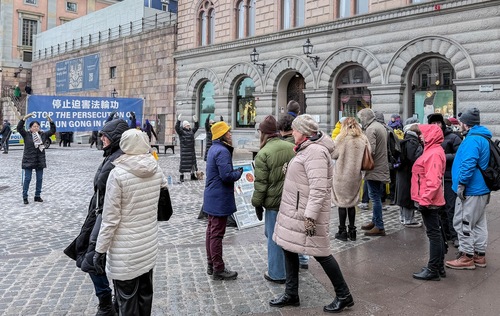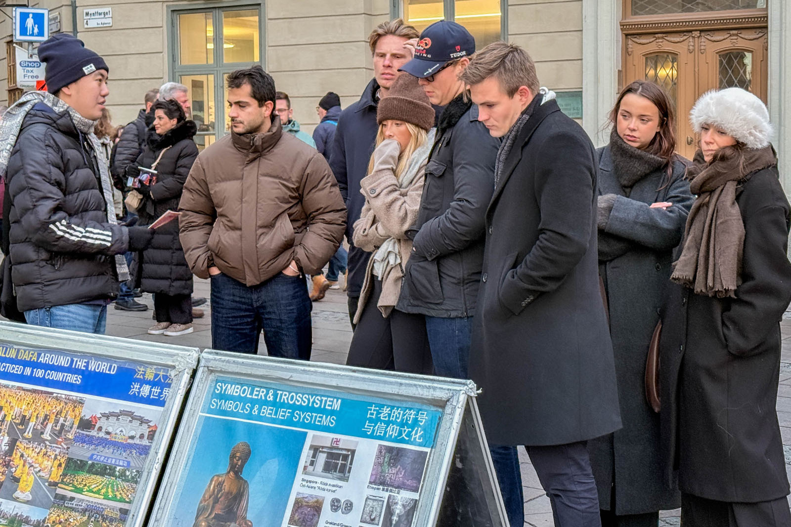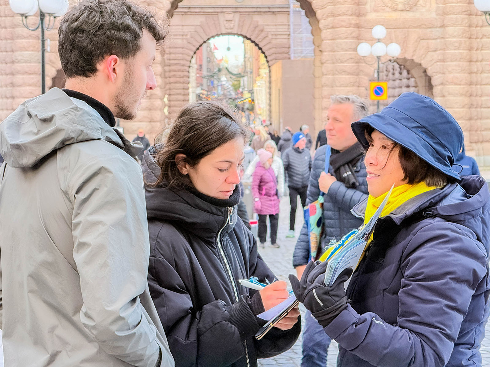 Jarmark Bożonarodzeniowy w pobliżu sztokholmskiego Starego Miasta otworzył się w listopadzie. Wydarzenie praktykujących odbyło się w pobliżu ścieżki prowadzącej do Starego Miasta i Zamku Królewskiego, a tłumy turystów przechodziły obok. Niektórzy praktykujący demonstrowali ćwiczenia, podczas gdy inni rozmawiali z przechodniami, rozdawali ulotki, zbierali podpisy i podnosili świadomość na temat prześladowań ze strony Komunistycznej Partii Chin i sankcjonowanego przez państwo procederu grabieży organów.