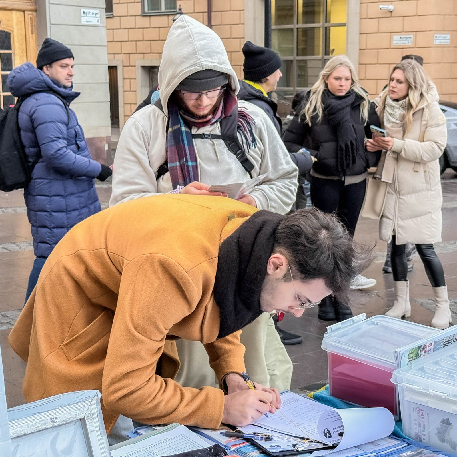 (Minghui.org) Praktykujący Falun Dafa prowadzili zajęcia na placu Mynttorget, niedaleko budynku szwedzkiego parlamentu, w piątki i soboty w listopadzie 2025 roku. Prezentowali ćwiczenia, podnosili świadomość na temat prześladowań ze strony Komunistycznej Partii Chin (KPCh) i zbierali podpisy pod petycją o ich zakończenie. Wiele osób podpisało petycję, wyrażając podziw dla odwagi praktykujących. Podczas tych wydarzeń niektórzy chińscy turyści zrzekli się przynależności do KPCh i organizacji z nią powiązanych.