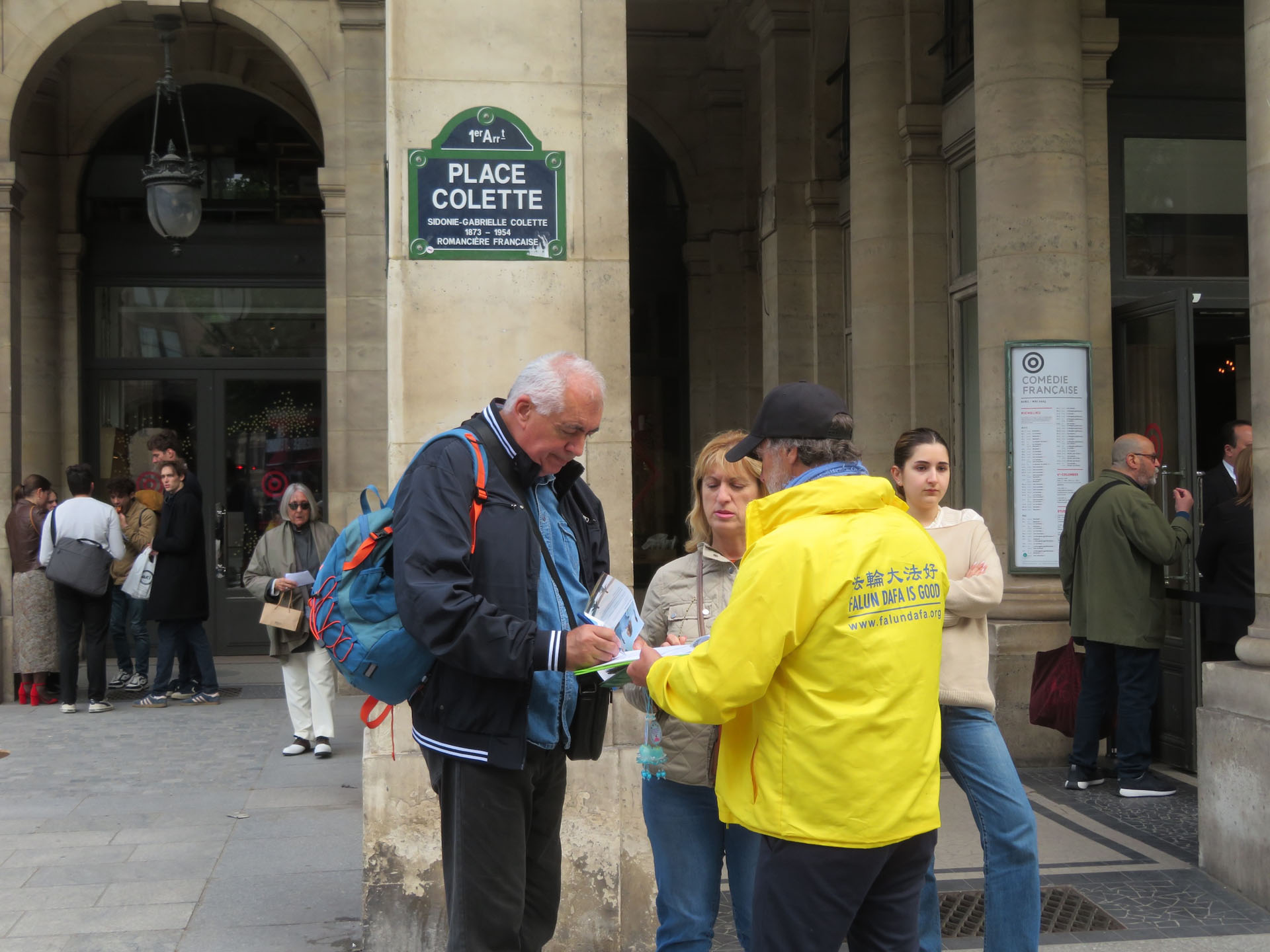 (Minghui.org) 8 maja praktykujący w Paryżu zorganizowali wydarzenie na Place Colette w 1. dzielnicy, aby uczcić 26. rocznicę Światowego Dnia Falun Dafa (13 maja). Wydarzenie obejmowało ćwiczenia grupowe, występy muzyczne i taniec smoka. Wiele osób zatrzymało się, aby popatrzeć, zrobić zdjęcia i nagrać filmy. Niektórzy nauczyli się, jak wykonywać ćwiczenia, podczas gdy inni podpisali petycję, aby wesprzeć wysiłki praktykujących na rzecz ujawnienia prześladowań.