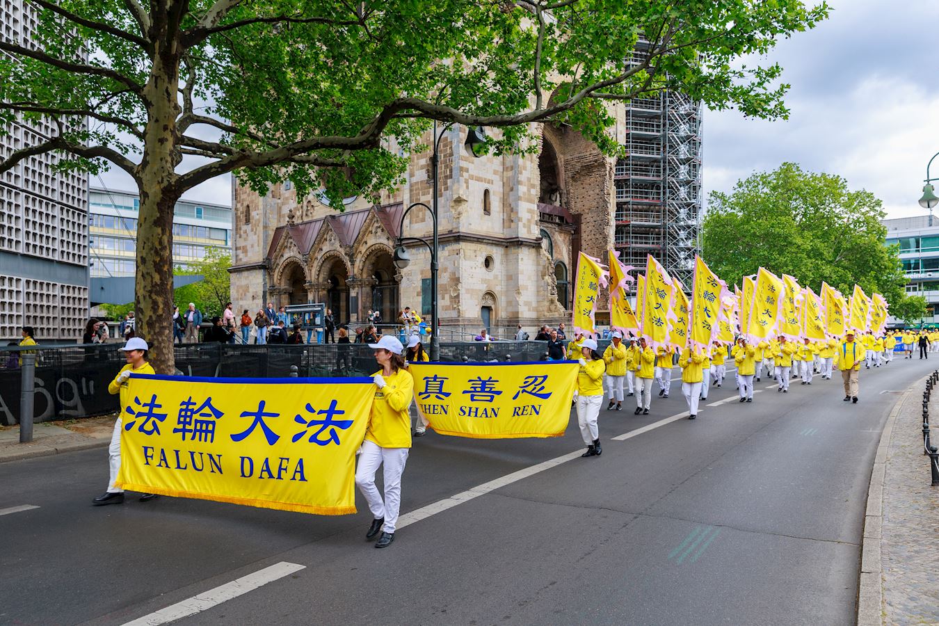 Uczestnicy parady i różne grupy występujące świętują Światowy Dzień Falun Dafa w Berlinie.