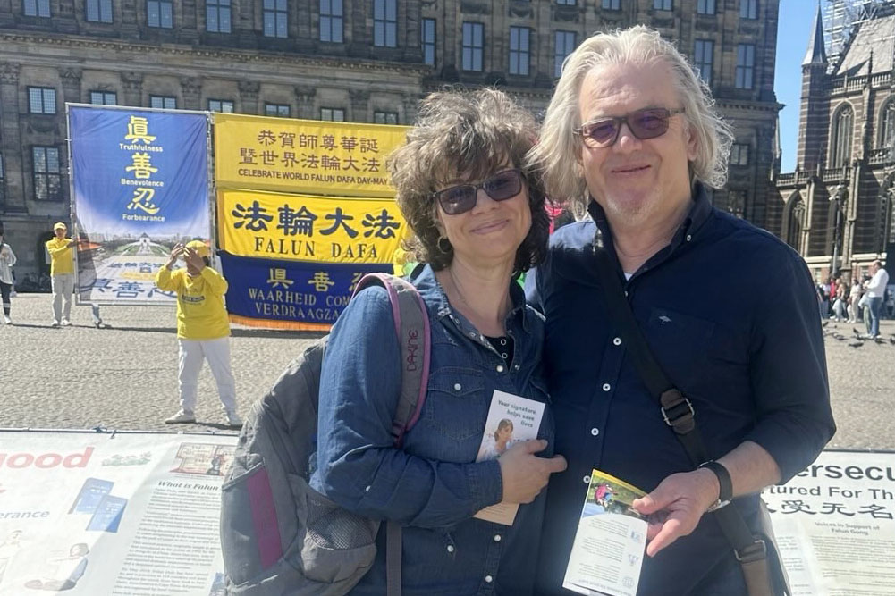 (Minghui.org) 10 maja 2025 r. praktykujący zorganizowali wielki wiec na Placu Amsterdamskim w stolicy Amsterdamu, aby uczcić 26 Światowy Dzień Falun Dafa i 33 rocznicę wprowadzenia Falun Dafa na świat. Złożyli również życzenia urodzinowe swojemu założycielowi, mistrzowi Li Hongzhi.