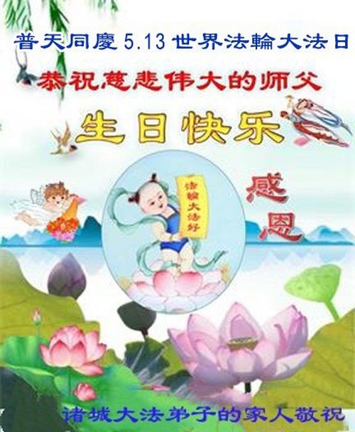 Rodzina praktykującego Falun Dafa w Zhucheng, Weifang, prowincja Shandong, świętuje Światowy Dzień Falun Dafa! Z szacunkiem życzymy Mistrzowi Li wszystkiego najlepszego z okazji urodzin!