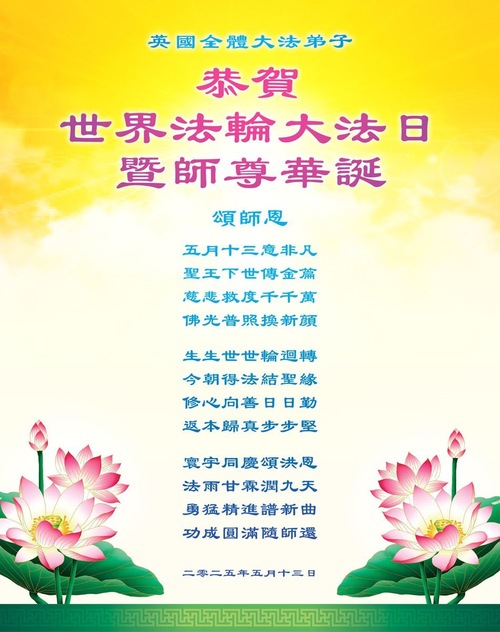 (Minghui.org) Praktykujący w Szwajcarii, Niemczech, Francji, Wielkiej Brytanii i Irlandii obchodzą Światowy Dzień Falun Dafa i 33. rocznicę upublicznienia Falun Dafa. Z szacunkiem składają Czcigodnemu Mistrzowi życzenia urodzinowe i wyrażają wdzięczność za współczujące zbawienie Mistrza.