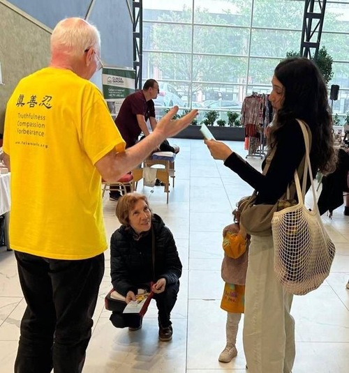 Młoda rodzina czytała informacje o prześladowaniach dokonywanych przez zarząd w sobotni poranek, gdy praktykujący przybyli do stoiska. Po skończeniu, powiedzieli praktykującym, że wcześniej nie słyszeli o Falun Dafa, ale byli zainteresowani tą praktyką. Jeden z nich powiedział, że „nie ma sensu prześladować ludzi, którzy próbują stać się lepsi”. Nie wiedzieli o prześladowaniach, ale byli świadomi, że w Chinach dzieją się „nienormalne” rzeczy.