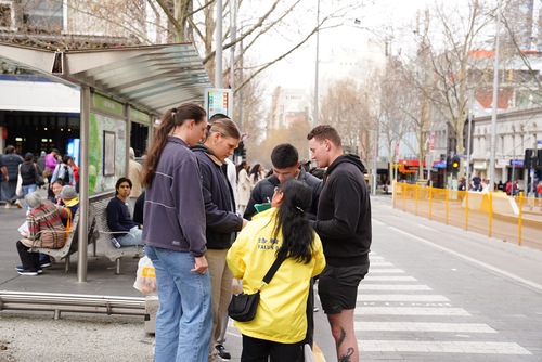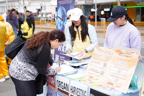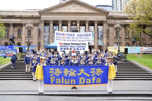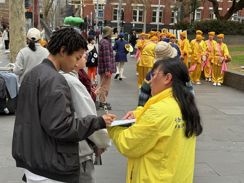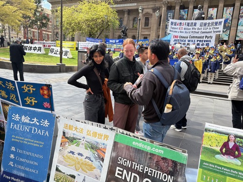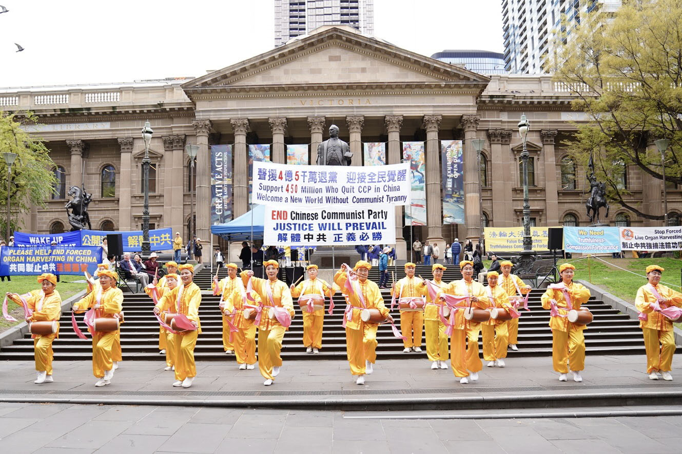 (Minghui.org) Praktykujący Falun Dafa (Falun Gong) zorganizowali wiec przed Biblioteką Stanową Wiktorii w Melbourne w Australii, 13 września 2025 r. Złożyli gratulacje 450 milionom Chińczyków, którzy zrzekli się obecnego i byłego członkostwa w Komunistycznej Partii Chin (KPCh) i powiązanych z nią organizacji. Barwne transparenty oraz występy Orkiestry Marszowej Tian Guo i zespołu perkusistów przyciągały przechodniów, którzy zatrzymywali się i dowiadywali o wydarzeniu.