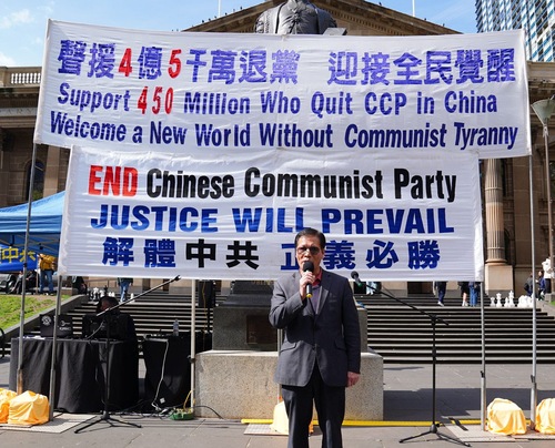 Pan Sun z Globalnego Centrum Obsługi Odejścia z KPCh w Melbourne przemawiał do uczestników wiecu i powiedział, że ci, którzy zdecydowali się odejść z KPCh, „reprezentują przebudzenie życia, odrodzenie sumienia i walkę ludzkości z tyranią”.