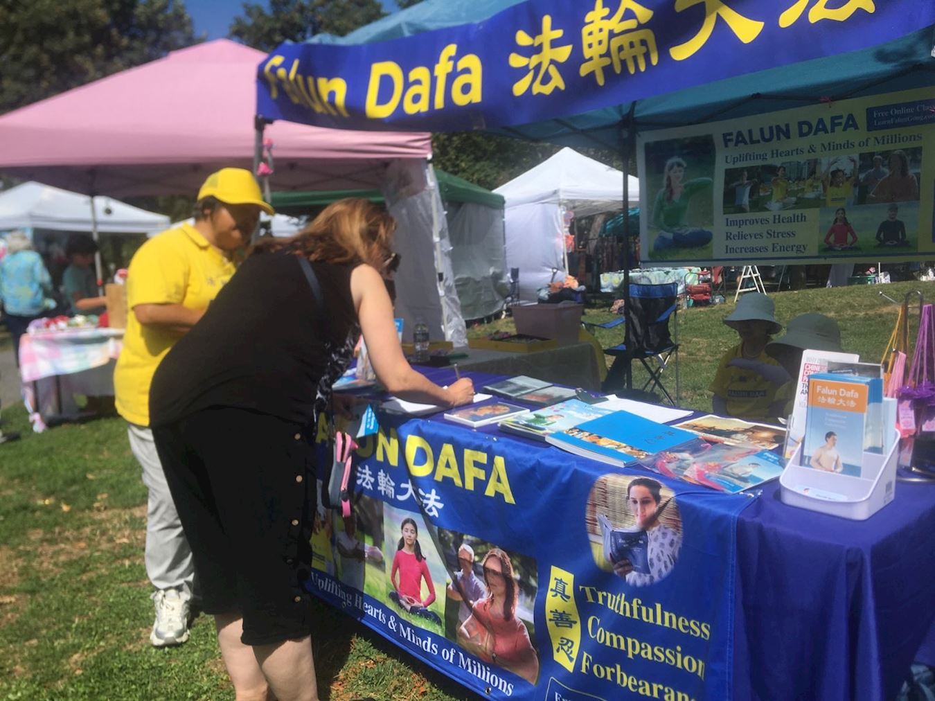 Praktykujący z Rhode Island i Massachusetts rozstawili stoisko, rozdawali ulotki wprowadzające i prezentowali pełne gracji, kojące ćwiczenia w malowniczym parku nad rzeką. W ciszy późnego lata ludzie przychodzili jeden po drugim, często w grupach. Niektórzy przyjmowali ulotki i zadawali pytania, aby dowiedzieć się więcej o praktyce i prześladowaniach ze strony Komunistycznej Partii Chin (KPCh), podczas gdy inni wyrażali chęć nauczenia się ćwiczeń.