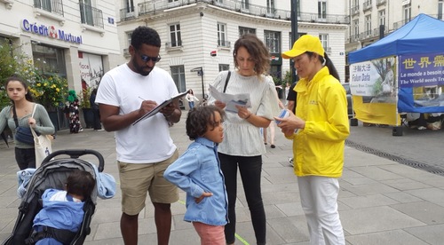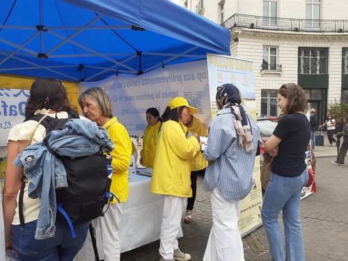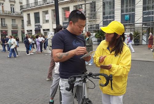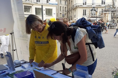 Młoda dziewczyna zadzwoniła do swojej matki w Nicei, gdy tylko zobaczyła banery Falun Dafa. Po podpisaniu petycji powiedziała praktykującym, że jej matka jest aktywistką praw człowieka i popiera ich wysiłki na rzecz zakończenia prześladowań. Praktykujący dali jej kopię francuskiej wersji Raportu Minghui: 20 lat prześladowań Falun Gong w Chinach, aby przekazała ją matce, co bardzo ją ucieszyło.