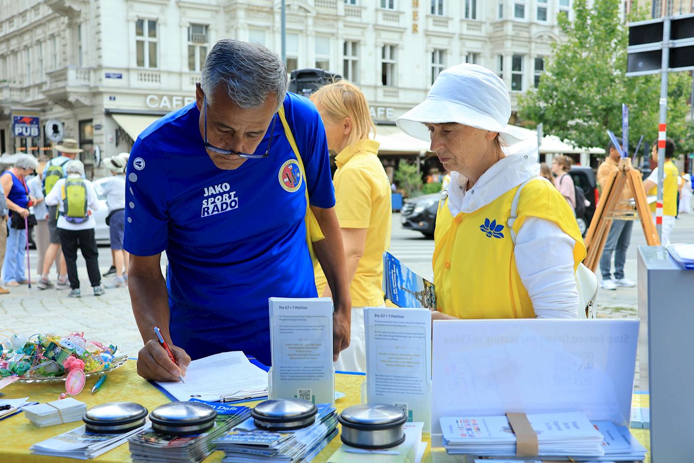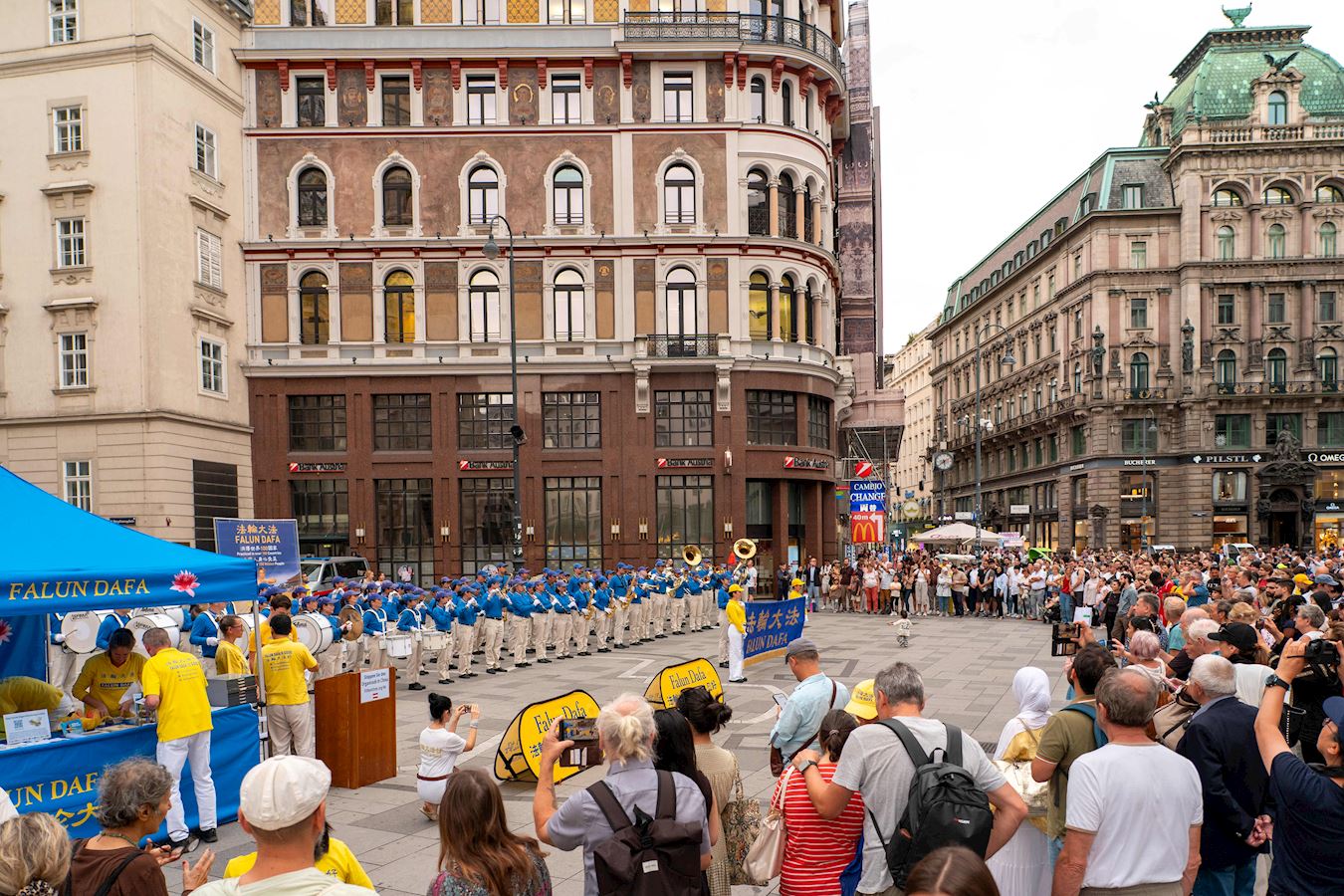 Orkiestra Marszowa Tian Guo wystąpiła na Helmut-Zilk-Platz w pobliżu Wiedeńskiej Opery Państwowej 30 sierpnia 2025 roku. Praktykujący rozwieszali plakaty, rozdawali ulotki i zbierali podpisy pod petycją.