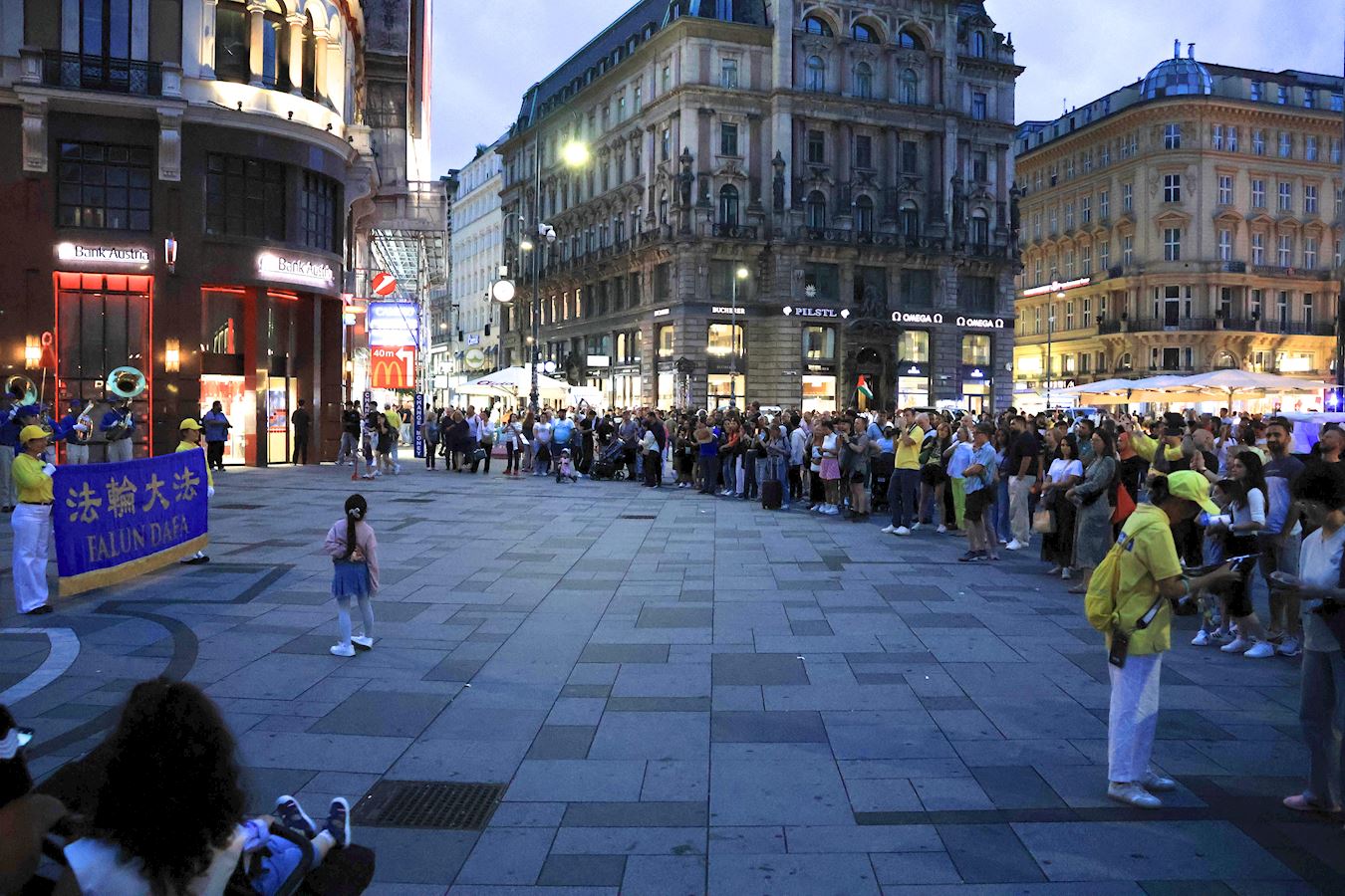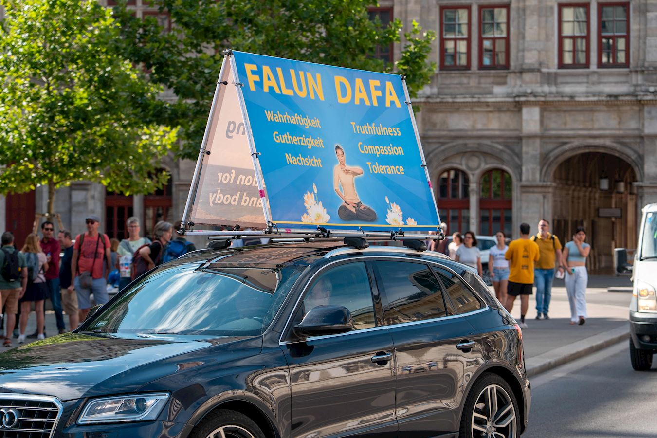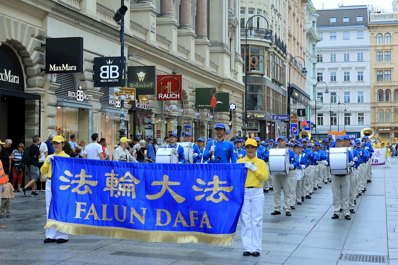 Praktykujący zorganizowali również paradę w centrum Wiednia. Orkiestra Marszowa Tian Guo prowadziła paradę, a praktykujący demonstrowali ćwiczenia Falun Dafa i nieśli transparenty z informacjami o Falun Dafa. Celem było szerzenie wiedzy o Falun Dafa i podniesienie świadomości społecznej na temat trwających prześladowań w Chinach.