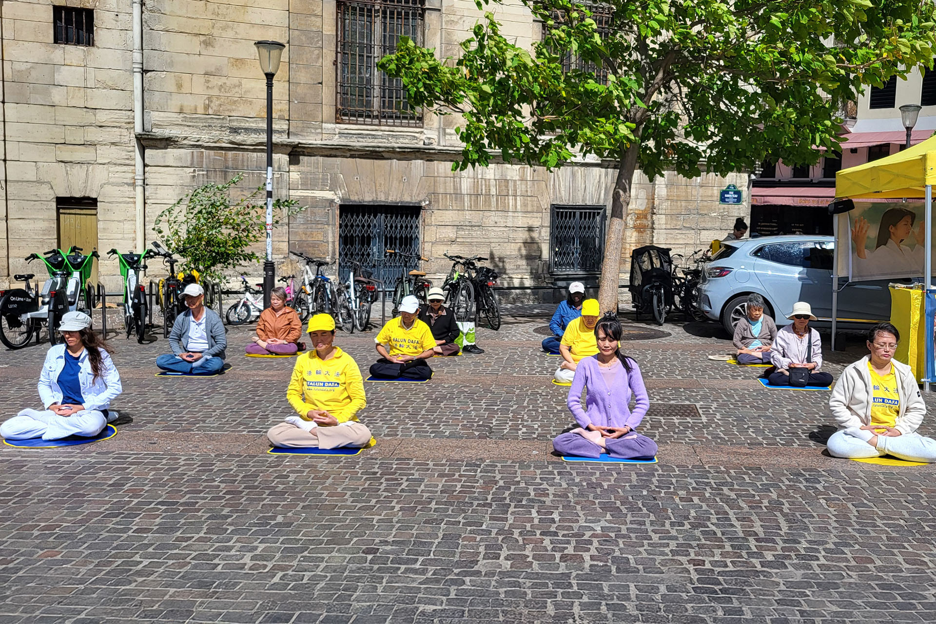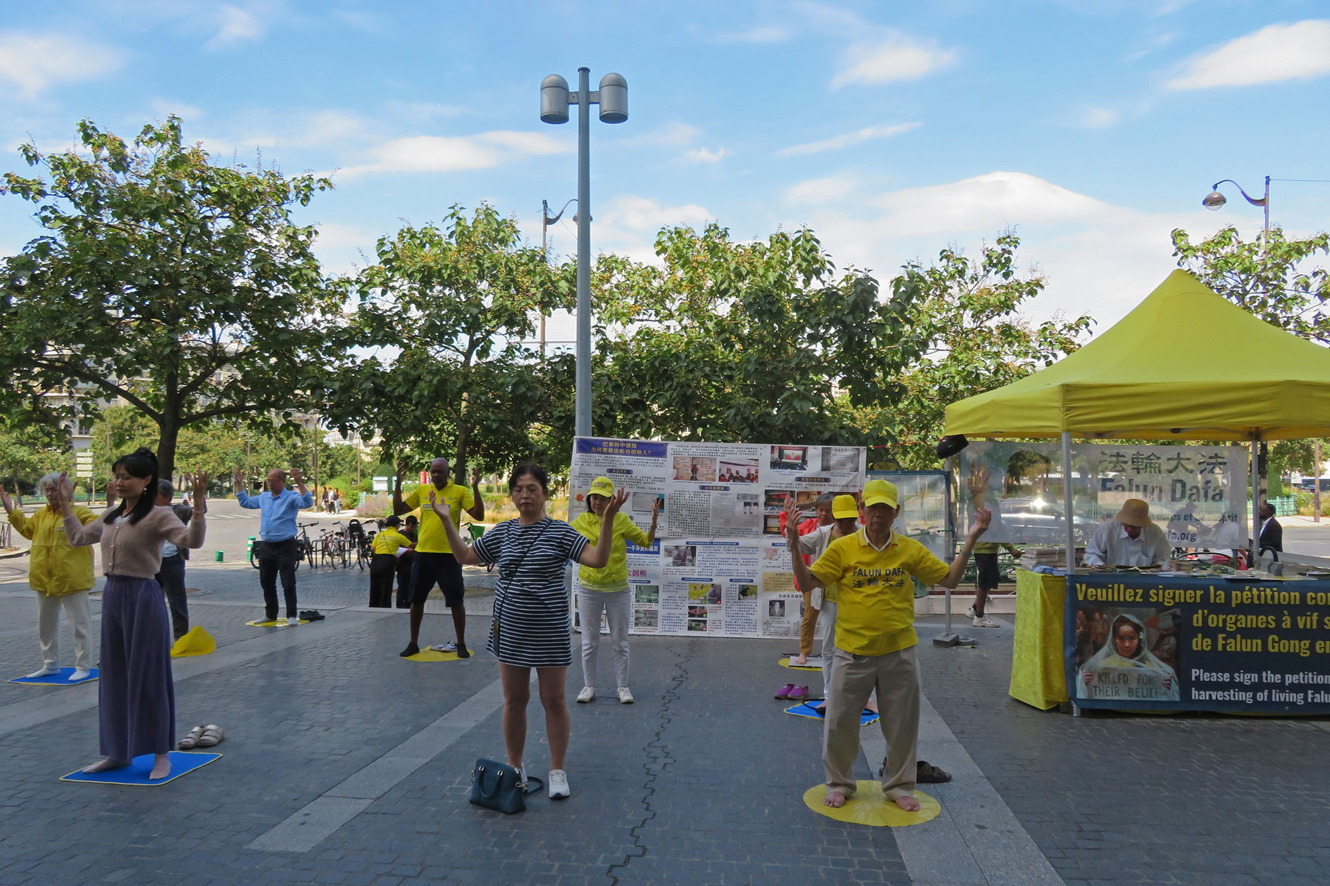 Praktykujący demonstrują ćwiczenia, opowiadają ludziom o prześladowaniach i zbierają podpisy w dzielnicy Châtelet 30 sierpnia