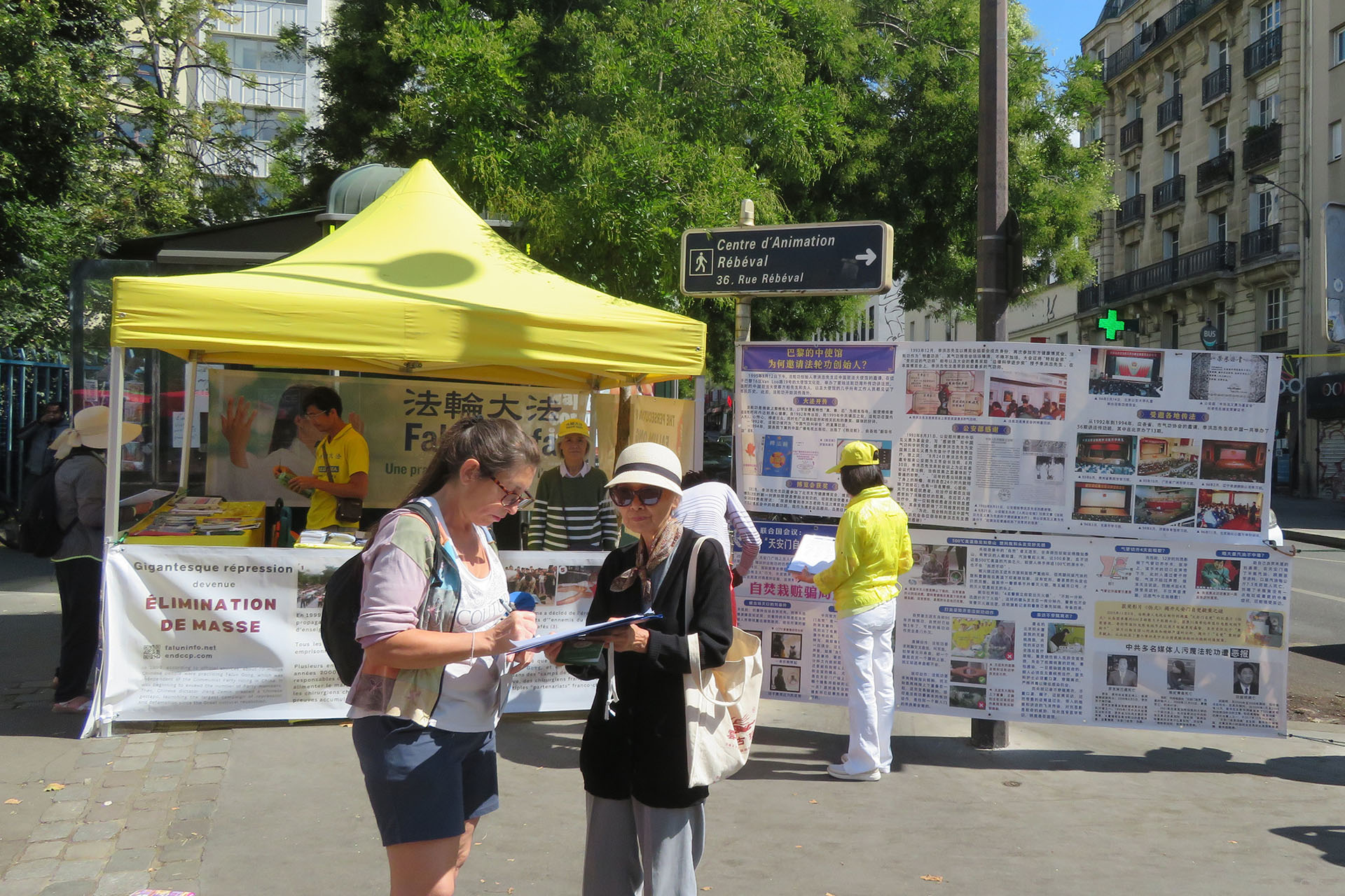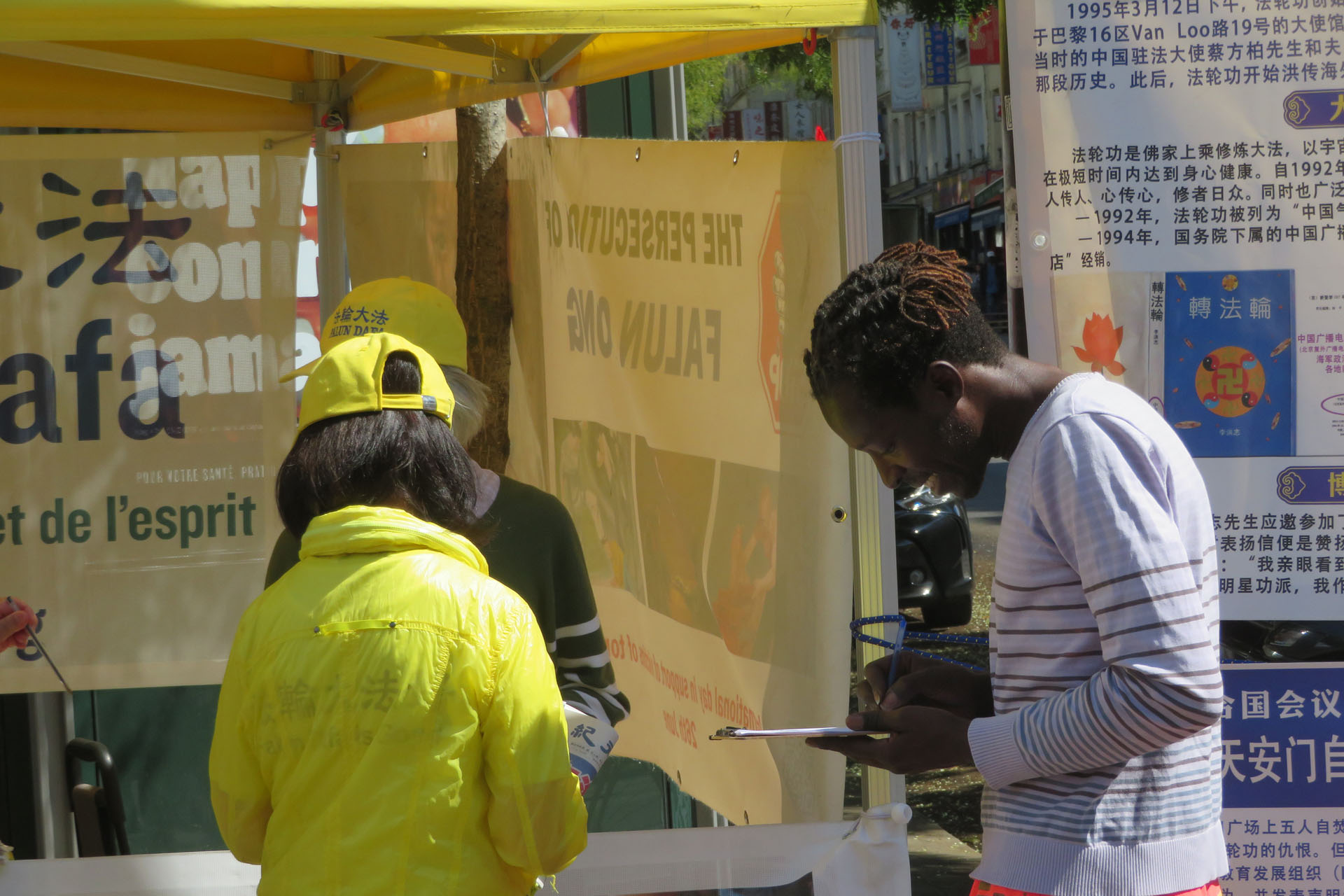 22 i 29 sierpnia, w dwa kolejne piątki, praktykujący organizowali wydarzenia w Belleville w Paryżu, znanym również jako chińska dzielnica. Praktykujący eksponowali plakaty w języku chińskim. Odwiedzający i opinia publiczna dowiedzieli się o prześladowaniach i podpisali petycję wzywającą do ich zakończenia.