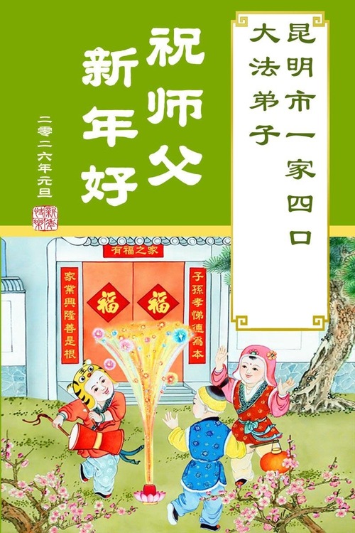 Czteroosobowa rodzina praktykujących, wraz z nowym praktykującym z miasta Kunming, z szacunkiem życzą Dobremu Wielkiemu Mistrzowi Szczęśliwego Nowego Roku!