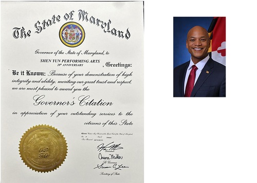 Wyróżnienie brzmi: „Gubernator stanu Maryland z okazji 20 rocznicy powstania SHEN YUN PERFORMING ARTS.