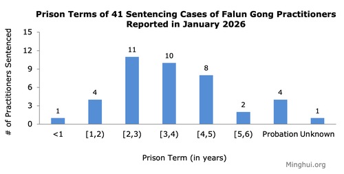 (Minghui.org) W styczniu 2026 r. zgłoszono łącznie 41 przypadków praktykujących Falun Gong skazanych na karę więzienia za swoją wiarę.