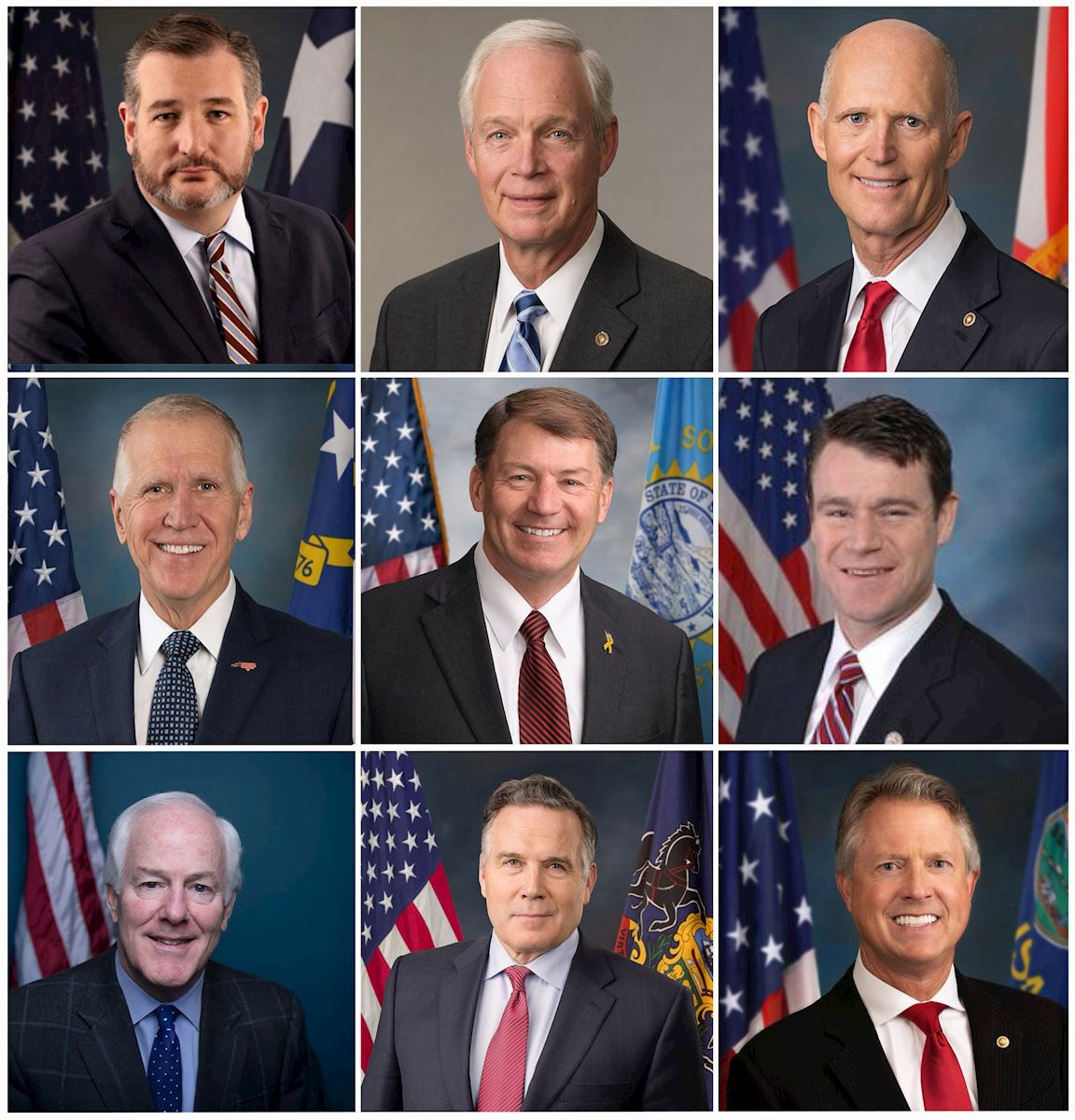 (Pierwszy rząd, od lewej do prawej): autor ustawy, republikański senator z Teksasu Ted Cruz, współautorzy: senatorowie Ron Johnson (Wisconsin) i Rick Scott (Floryda);