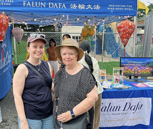 Courtney (po lewej) i jej matka przy stoisku Falun Dafa