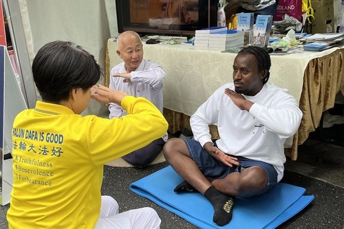 Waswa Kabuye zatrzymał się przy stoisku, aby dowiedzieć się więcej o Falun Dafa i spróbować medytacji.