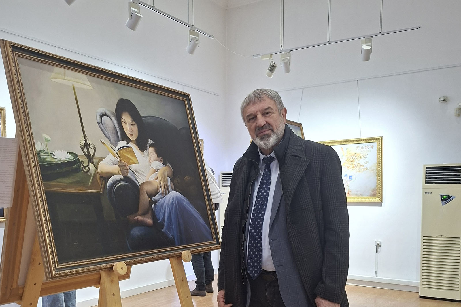 Dragomir Draganov, gubernator regionalny, obok obrazu „Iluminacja” autorstwa Xiaoping Chen