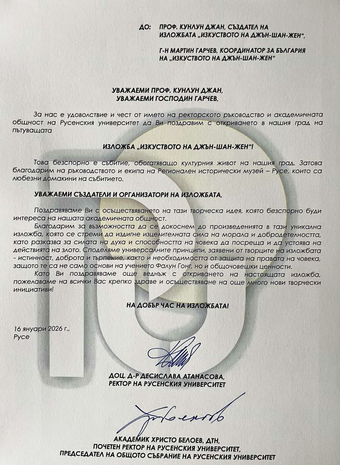 Profesor Ivanova była specjalną wysłanniczką profesor Desislavy Atanasovej, rektor Uniwersytetu im. Angela Kancheva w Ruse, oraz honorowego rektora, akademika Hristo Beloeva, dr. W imieniu profesor Atanasovej wygłosiła przemówienie gratulacyjne do koordynatora wystawy „Sztuka Zhen-Shan-Zhen”.