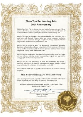 „W ZWIĄZKU Z POWYŻSZYM POSTANAWIA SIĘ, że ja, Steven M. Neuhaus, niniejszym uznaję: 20 rocznicę Shen Yun Performing Arts„i zachęcam wszystkich mieszkańców do przyłączenia się do świętowania tego niezwykłego osiągnięcia oraz inspiracji, jaką Shen Yun dostarcza widzom na całym świecie”.