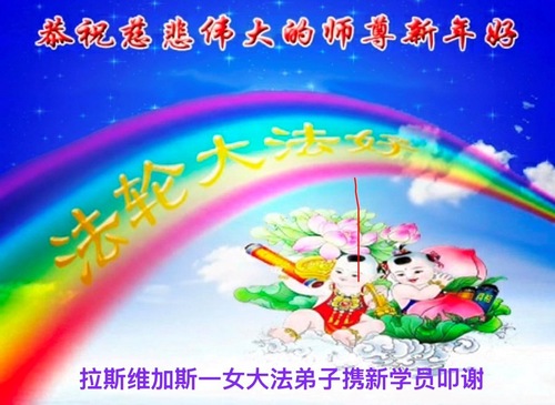 Praktykująca kobieta i nowy praktykujący z Las Vegas życzą czcigodnemu Mistrzowi szczęśliwego chińskiego Nowego Roku!
