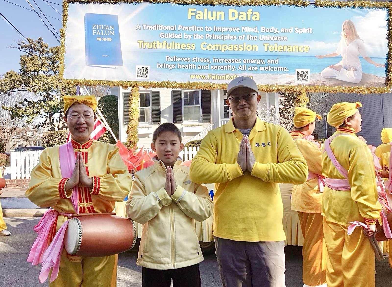Xu Shaofei, który jest inżynierem, niósł transparent na czele procesji praktykujących. Jego żona Gao Meixia, która jest lekarzem, jest członkiem zespołu grającego na bębnach. Ich syn prezentował ćwiczenia na platformie.