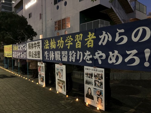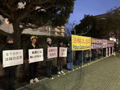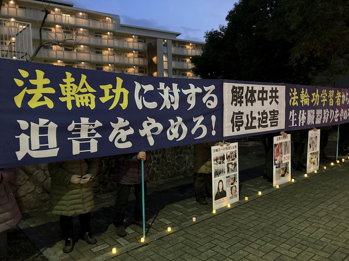 Praktykujący z okolic Kumamoto protestowali przed chińskim konsulatem w Fukuoce w sylwestra, 16 lutego