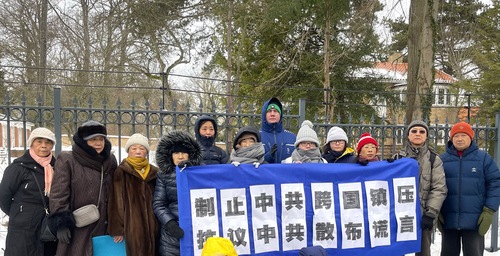 (Minghui.org) Praktykujący z Danii i krajów sąsiednich zgromadzili się 16 lutego 2026 roku przed chińską ambasadą w Kopenhadze, aby zaprotestować przeciwko oczernianiu i zastraszaniu Falun Dafa (Falun Gong) oraz Shen Yun Performing Arts przez ambasadę. Ambasada opublikowała na swojej stronie internetowej oświadczenie, aby zniechęcić ludzi do oglądania światowej sławy spektaklu Shen Yun.
