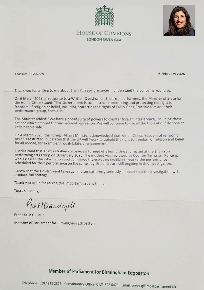 Preet Kaur Gill, posłanka z okręgu Birmingham Edgbaston, napisała: „W dniu 6 marca 2025 r., w odpowiedzi na pisemne pytanie dotyczące artystów Shen Yun, minister stanu w Ministerstwie Spraw Wewnętrznych stwierdził: „Rząd jest zaangażowany w promowanie i ochronę prawa do wolności religii lub przekonań, w tym ochrony praw praktykujących Falun Gong i ich grupy artystycznej Shen Yun”.