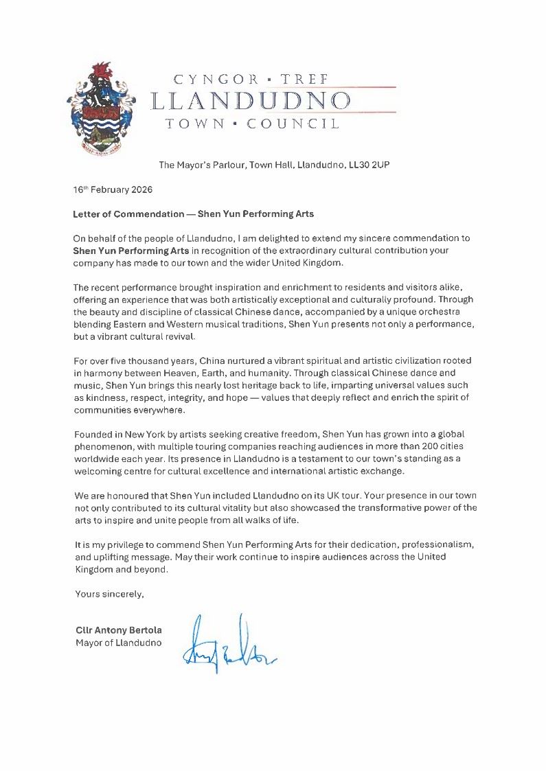 Dwa dni później napisał list do organizatora, w którym wyraził uznanie dla wielkiego wkładu spektaklu. „Przez ponad pięć tysięcy lat Chiny pielęgnowały żywą cywilizację duchową i artystyczną, zakorzenioną w harmonii między Niebem, Ziemią i ludzkością. Poprzez chiński klasyczny taniec i muzykę Shen Yun przywraca do życia to niemal utracone dziedzictwo, przekazując uniwersalne wartości, takie jak dobroć, szacunek, uczciwość i nadzieja – wartości, które głęboko odzwierciedlają i wzbogacają ducha społeczności na całym świecie” – napisał burmistrz Bertola.