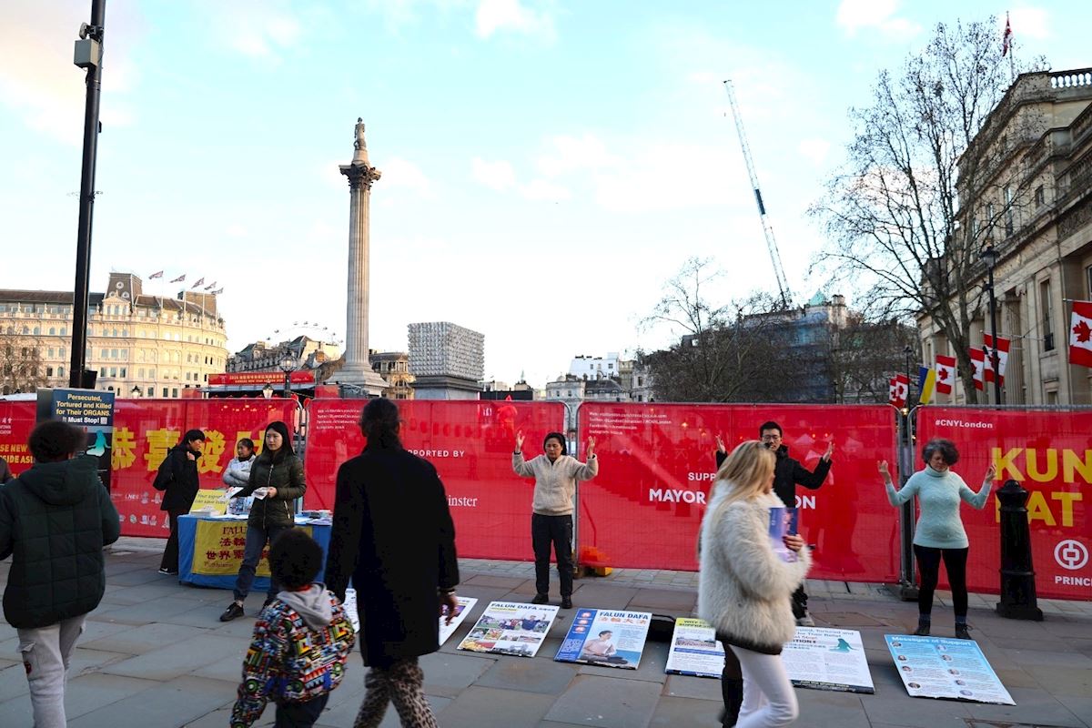 Tego dnia na Trafalgar Square ustawiono scenę, na której odbywały się śpiewy, tańce i przedstawienia teatralne. W Chinatown, oddalonej o trzy minuty spacerem od placu, odbyła się parada. Barwne dekoracje, lampiony oraz tańczące lwy i chińskie smoki w Chinatown przyciągnęły wielu turystów. Stoisko praktykujących znajdowało się po północnej stronie Trafalgar Square, jednego z najbardziej charakterystycznych brytyjskich punktów orientacyjnych, naprzeciwko Galerii Narodowej. Wiele osób zatrzymywało się przy stoisku praktykujących. Dowiedzieli się, że praktyka ta jest nauczana w ponad 100 krajach i regionach, a także o 26-letnich prześladowaniach w Chinach. Wielu podpisało petycję wzywającą Komunistyczną Partię Chin do zaprzestania prześladowań i zachęcało praktykujących do dalszego ujawniania zbrodni Komunistycznej Partii Chin.