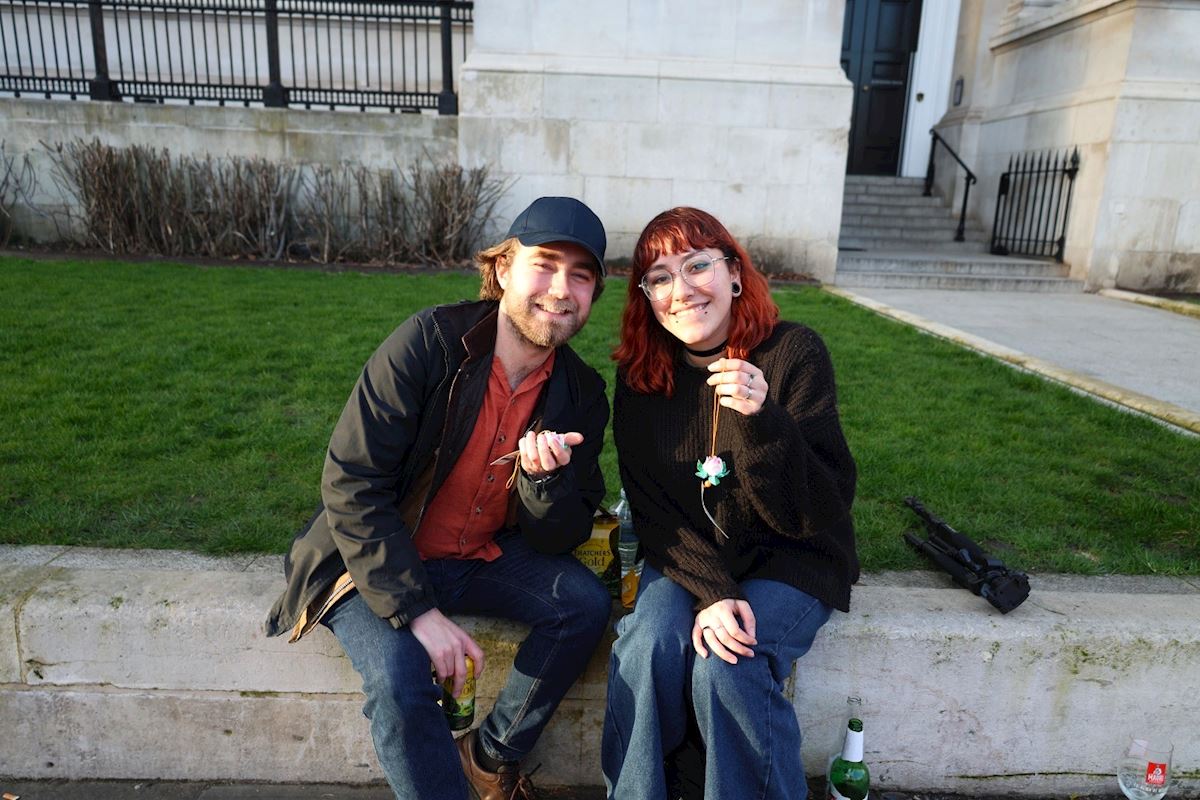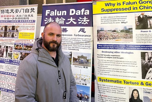 Wiele osób zatrzymało się, aby przeczytać informacje na plakatach praktykujących i podpisać petycję. Jamie był jednym z nich. Jamie pracował jako ochroniarz i powiedział, że jego macocha pochodzi z Hongkongu, więc co roku jego rodzina świętuje Chiński Nowy Rok.