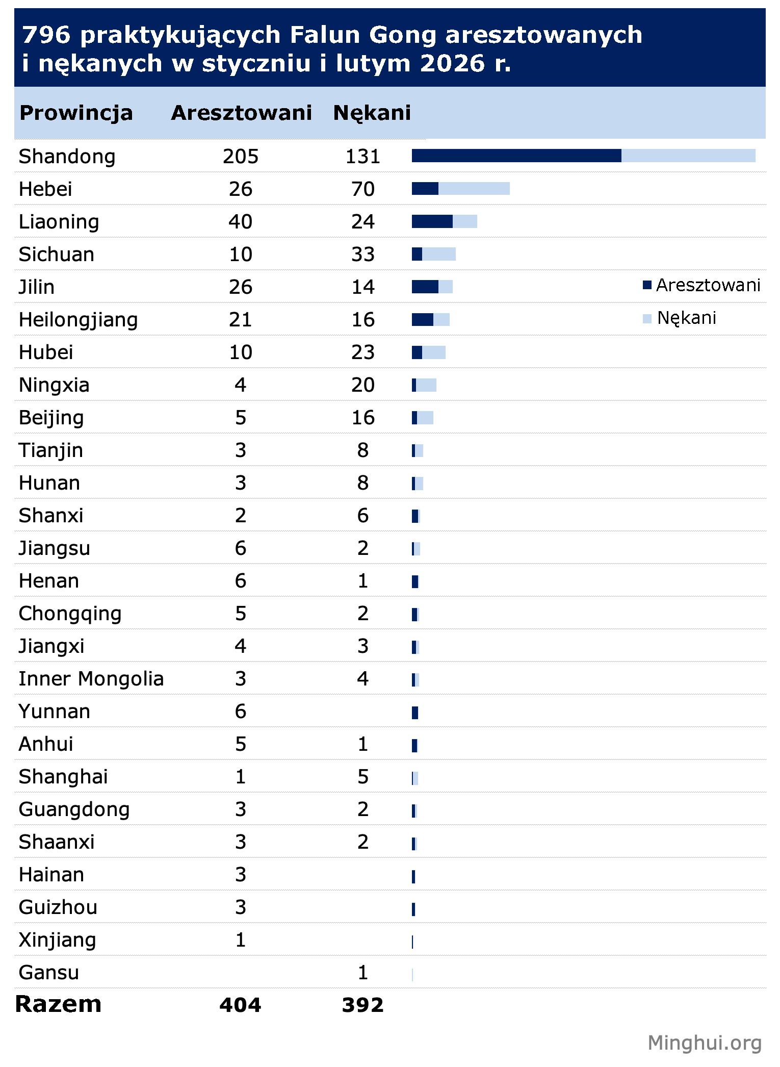 (Minghui.org) W styczniu i lutym 2026 r. łącznie 796 praktykujących Falun Gong zostało aresztowanych lub prześladowanych za swoją wiarę.